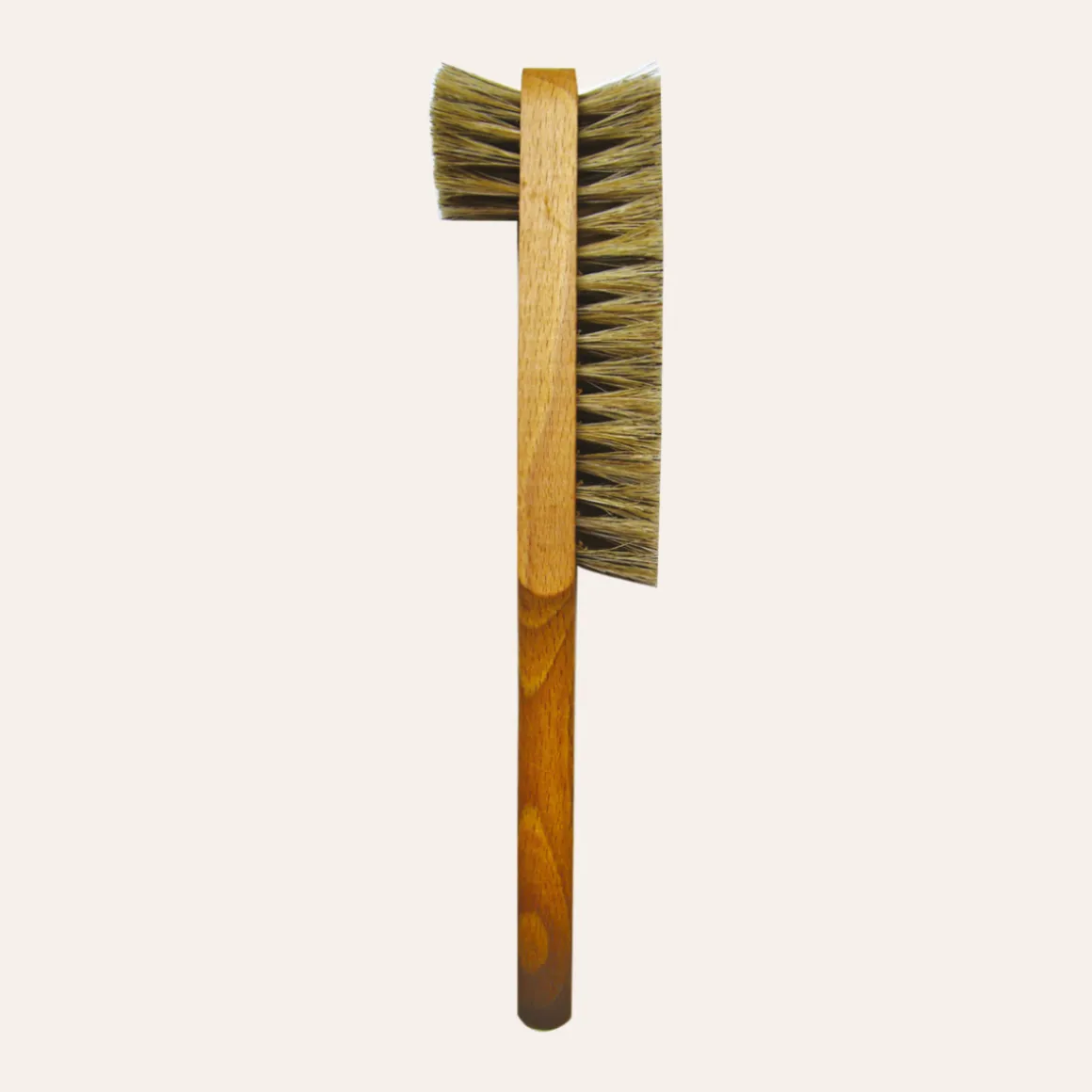 Ensidig skobørste av tre med påsmøre. Lys ekte hestehår.