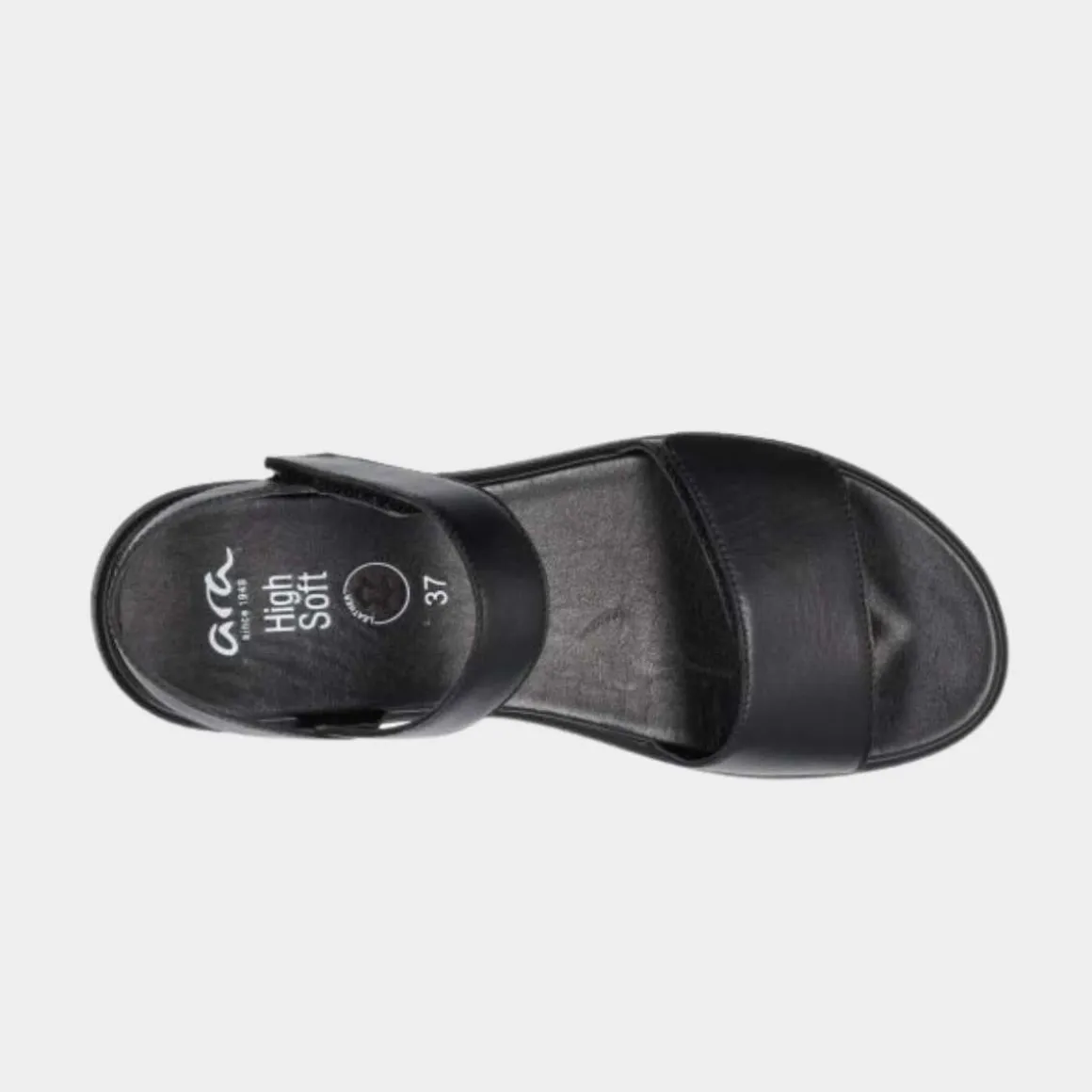 Komfortabel og stilig sandal fra Ara i svart skinn med uttagbar innersåle.
