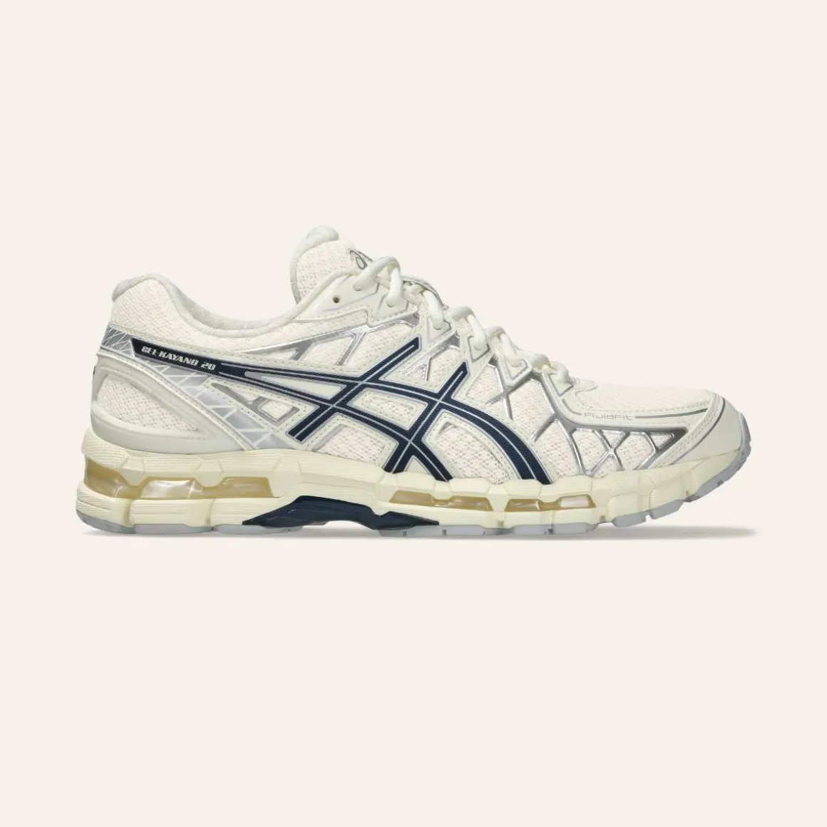GEL-KAYANO 20 sneaker fra Asics ble opprinnelig lansert i 2013, og er tidligere anerkjent for sine strukturelle dempingsegenskaper ved langdistanseløping. Den arkitektoniske estetikken er inspirert av design av bygninger og biler, og skaper en teknisk form som gir et bredt spekter av funksjoner for hverdagslige opplevelser.