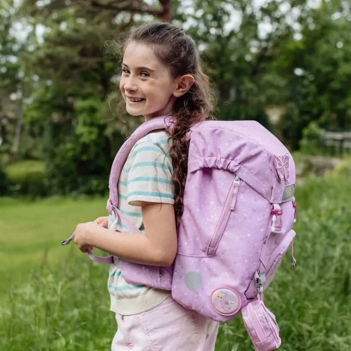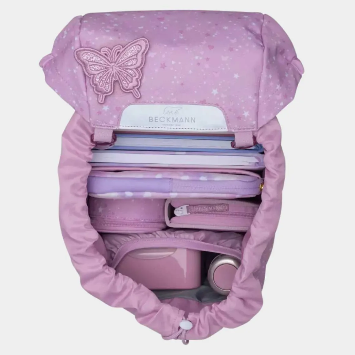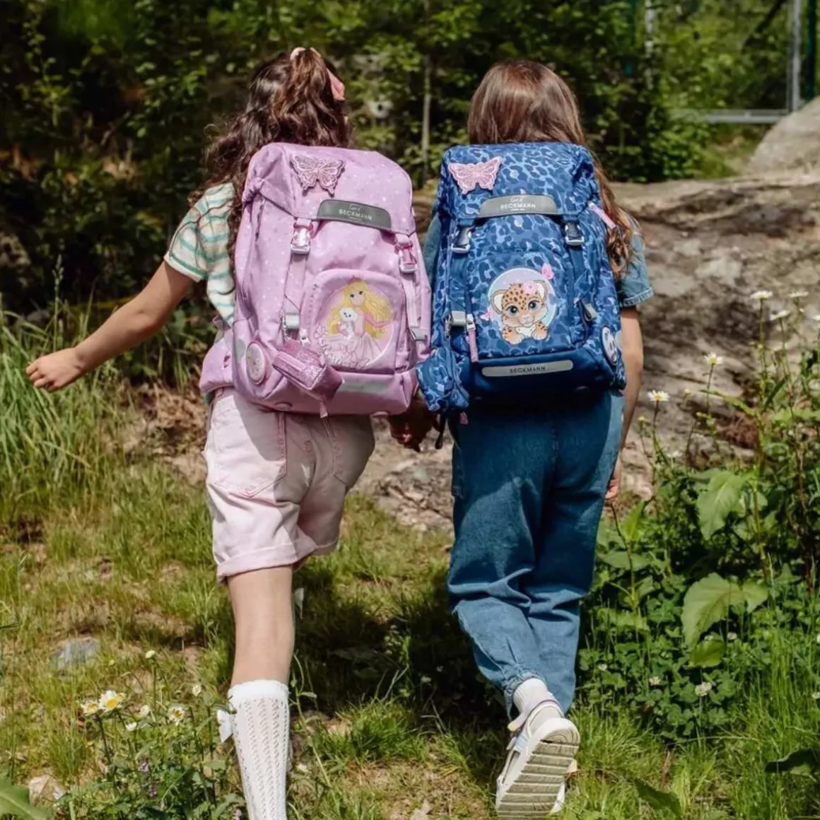 Ryggsekk fra Beckmann. I tillegg til figurer, mønster og farger, har sekkene fra Beckmann førsteklasses bærekomfort med polstring, justerbare stropper og vektfordeling. Sekken er utstyrt med regntrekk i lokket, en praktisk vanntett matbokslomme inni sekken, og mange ulike buttons som kan plasseres flere steder på sekken. Classic har rom for alt du trenger i skolehverdagen og er designet for å holde vekten inntil ryggen.