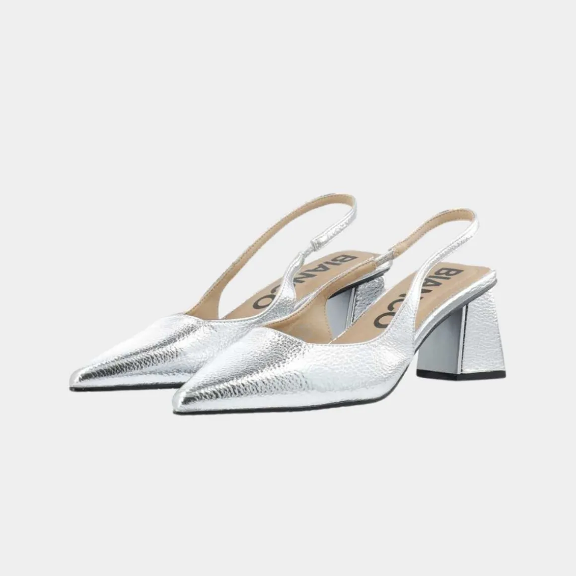 Lekker slingback i sølv fra Bianco med 6 cm hælhøyde. Overlær i patentskinn og elastiske slingback-stropper.