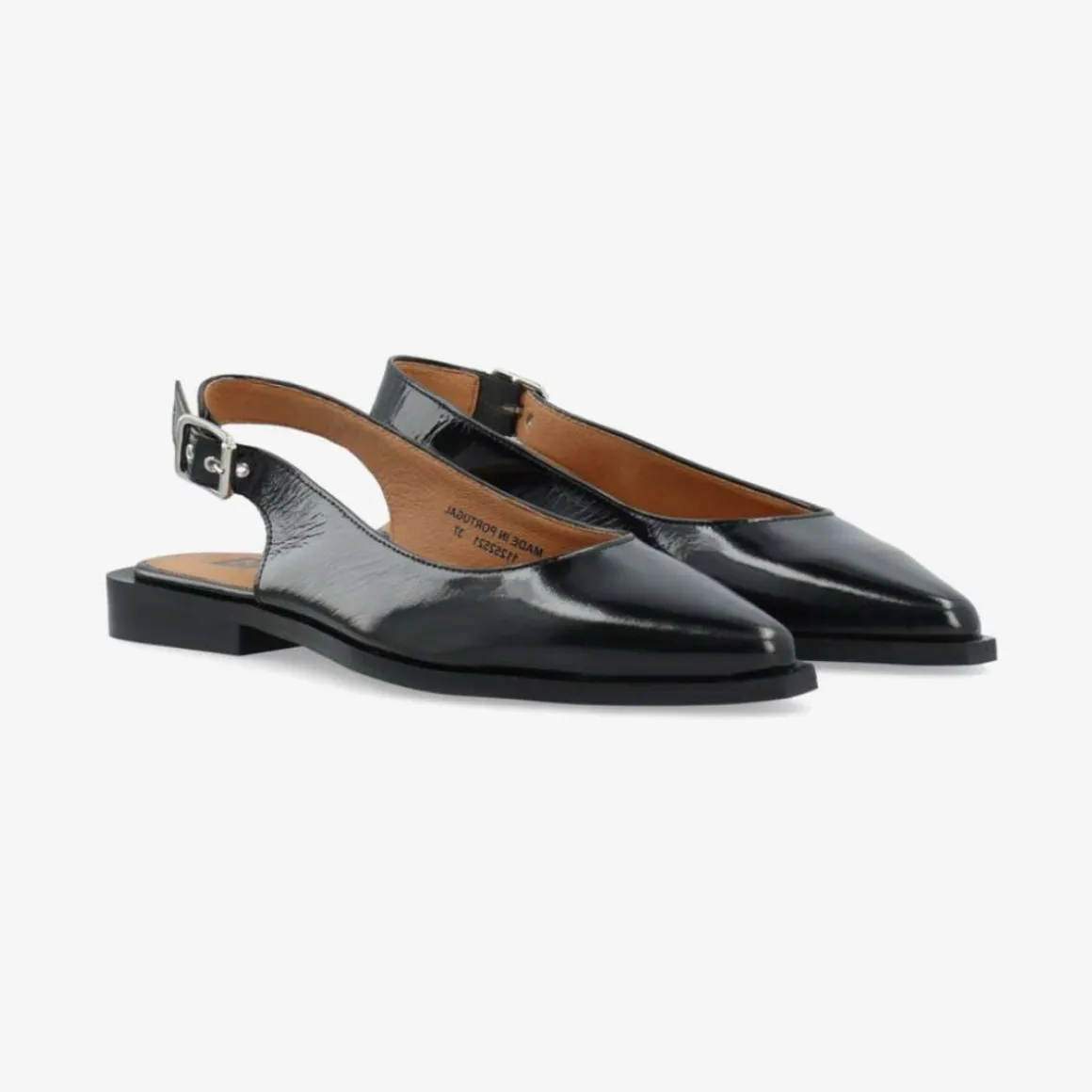 Overdelen er laget i glansfullt nappalak/patentskinn, som gir et eksklusivt preg. Den justerbare slingback-stroppen med spenne sikrer god passform og komfort gjennom hele dagen. Med en lav hæl på 2 cm får du en behagelig høyde som gjør skoen enkel å bruke over lengre tid.