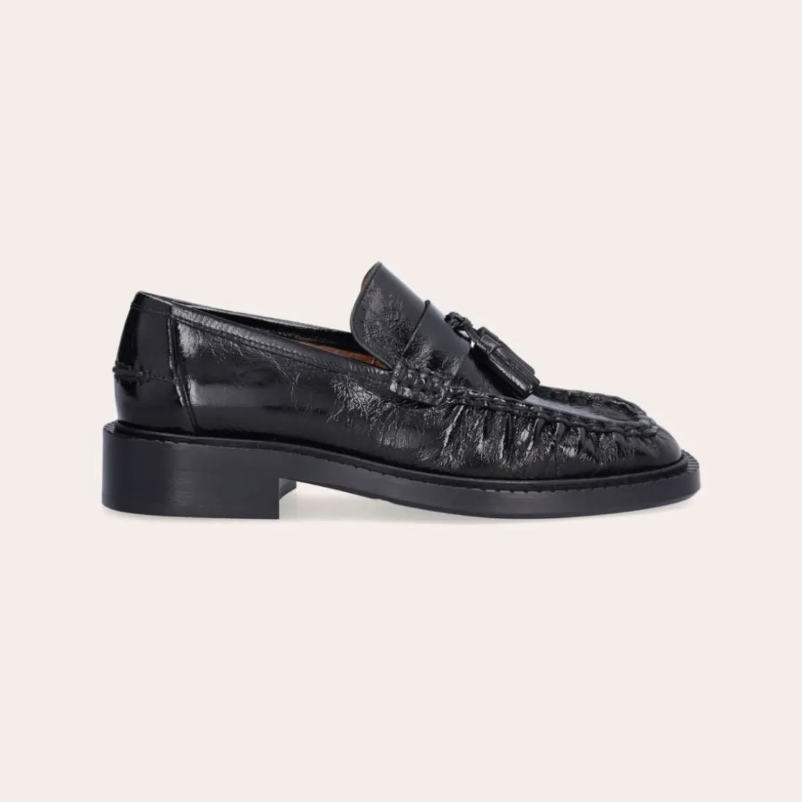 Eksklusiv damesko, laget for hånd i Portugal. Denne elegante loaferen er utført i sort lakkert skinn med firkantet tå for et moderne og stilrent uttrykk. Over vristen prydes den av en enkel stropp med to klassiske dusker, kombinert med markerte stikninger og lett rynket skinn – en detalj som fremhever den håndverksmessige kvaliteten.