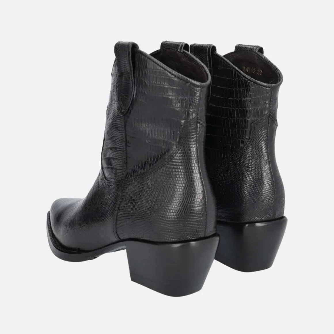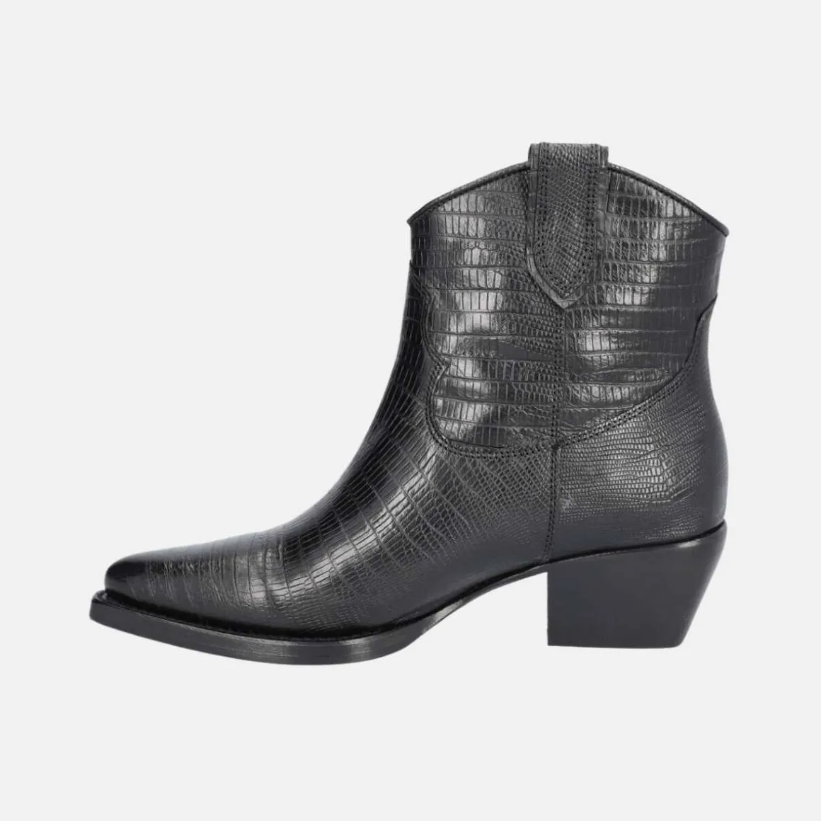 Håndlaget cowboystøvel fra Billi Bi, laget av sort glatt skinn med spiss tå. Støvelen er dekorert med en stropp på begge sider og et mønster av sting på skaftet. Fint croc-skinn som setter prikken over i-en på støvlene.