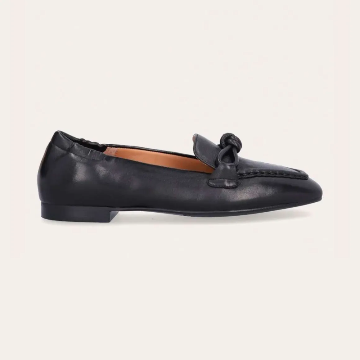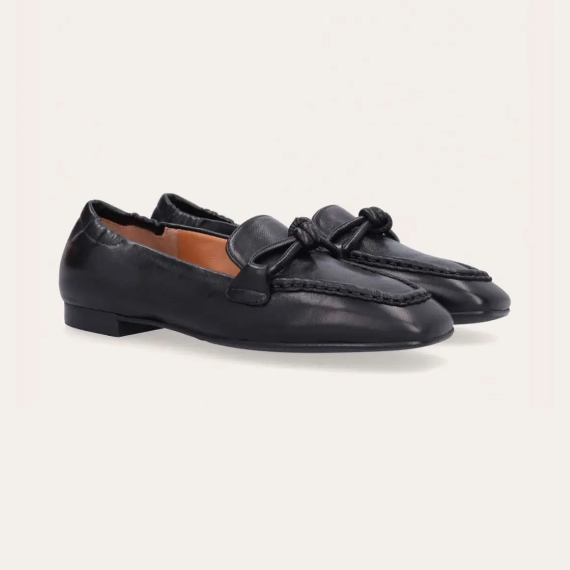 Elegant og tidløs loafer i sort glatt skinn, håndlaget i Spania. Modellen har en lett firkantet tå som gir et moderne uttrykk, og en dekorativ knutedetalj over forfoten som tilfører et sofistikert preg.