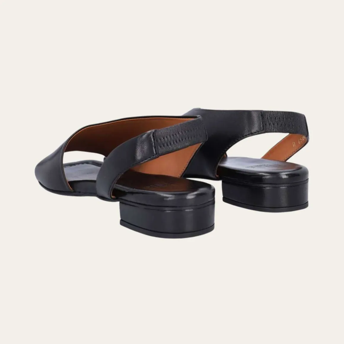 Sandalen har en rem rundt hælen med elastisk innside, som sikrer fleksibel og behagelig passform. Den lave hælen på 2 cm gir komfort gjennom hele dagen, mens skinnfôr og skinninnersåle sørger for en eksklusiv og myk følelse mot foten. Yttersålen i gummi gir godt grep og stabilitet.