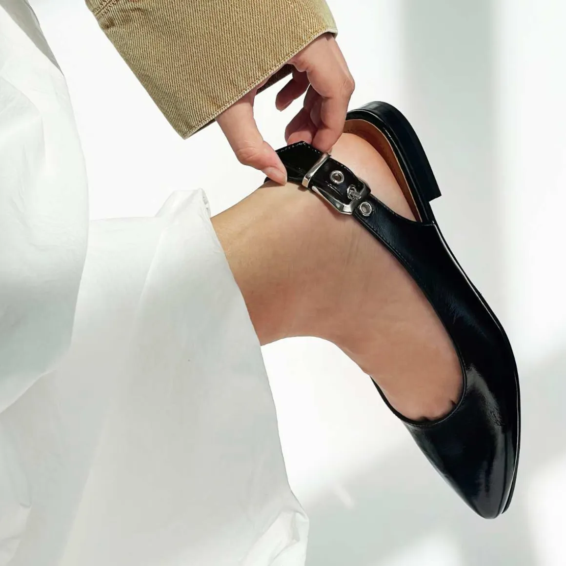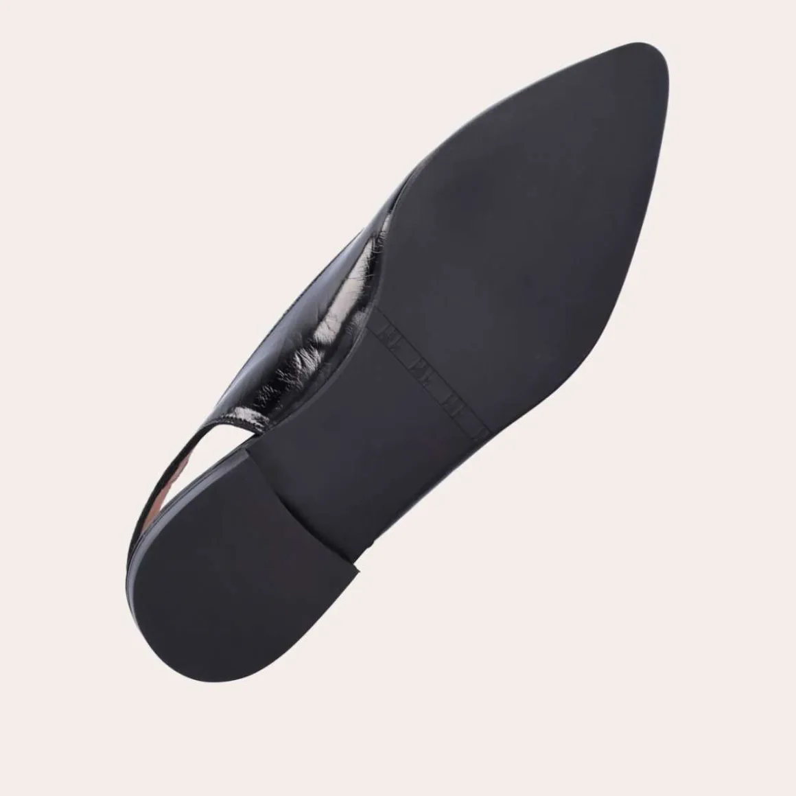 Håndlaget slingback ballerinasko med spiss tå, utført i sort lakkert skinn. Slingback-remmen lukkes med et sølvfarget spenne.