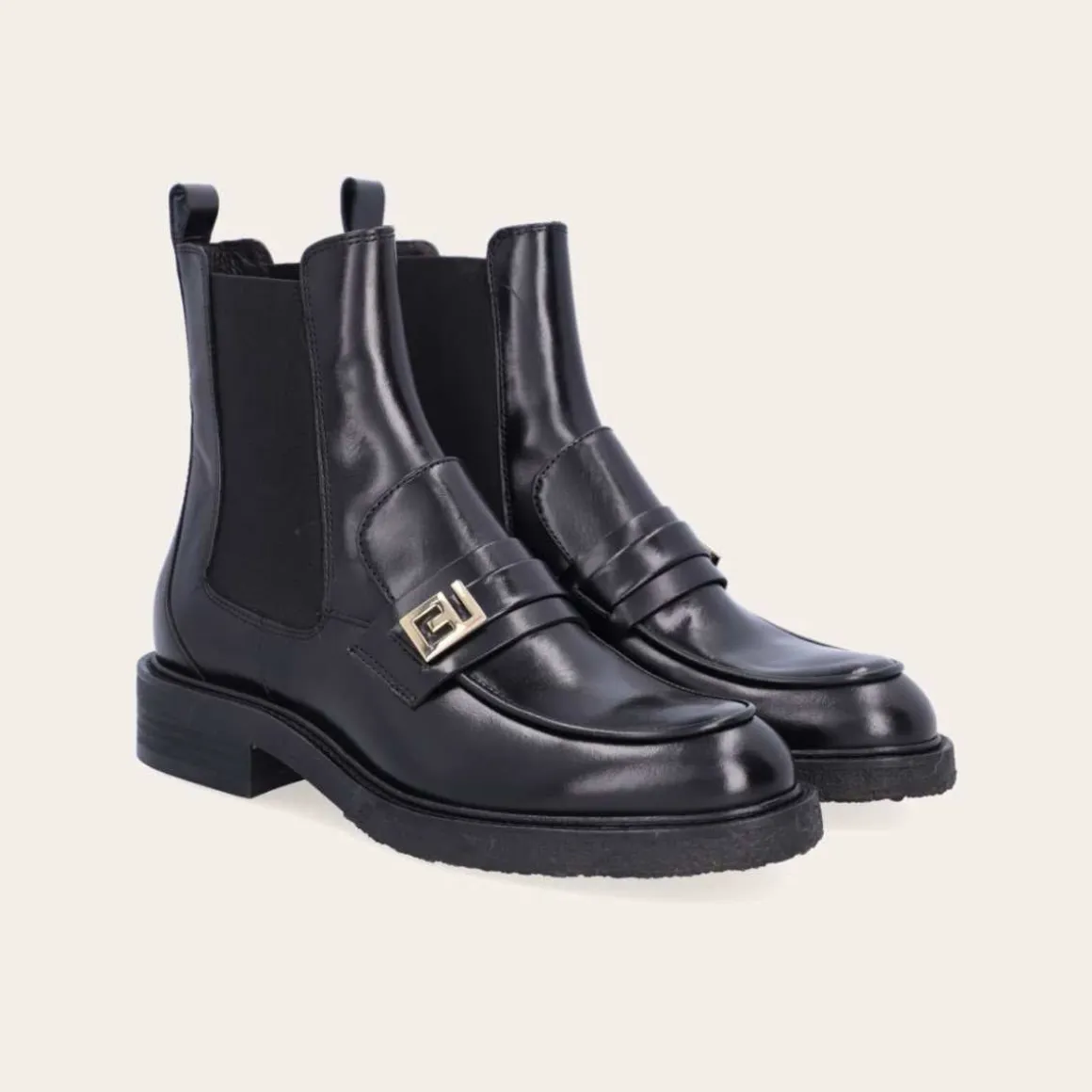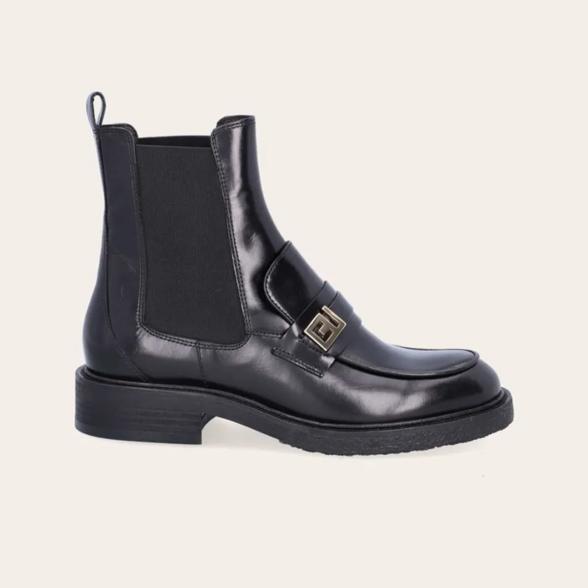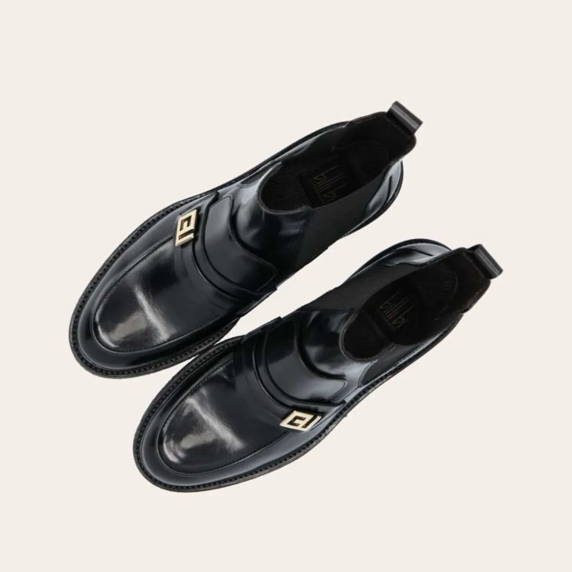 Håndlaget støvel fra Billi Bi, laget av svart glatt skinn med rund tå. Støvelen er dekorert med elastiske sidepaneler og en stropp bak. Støvelen er også dekorert med en gyllen spenne på siden av forfoten.