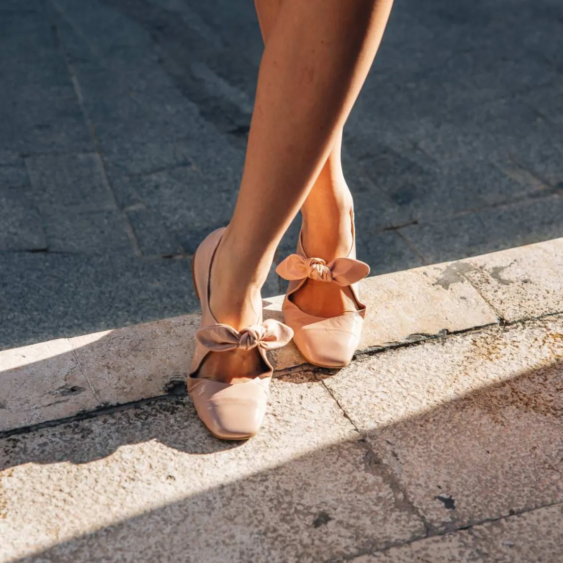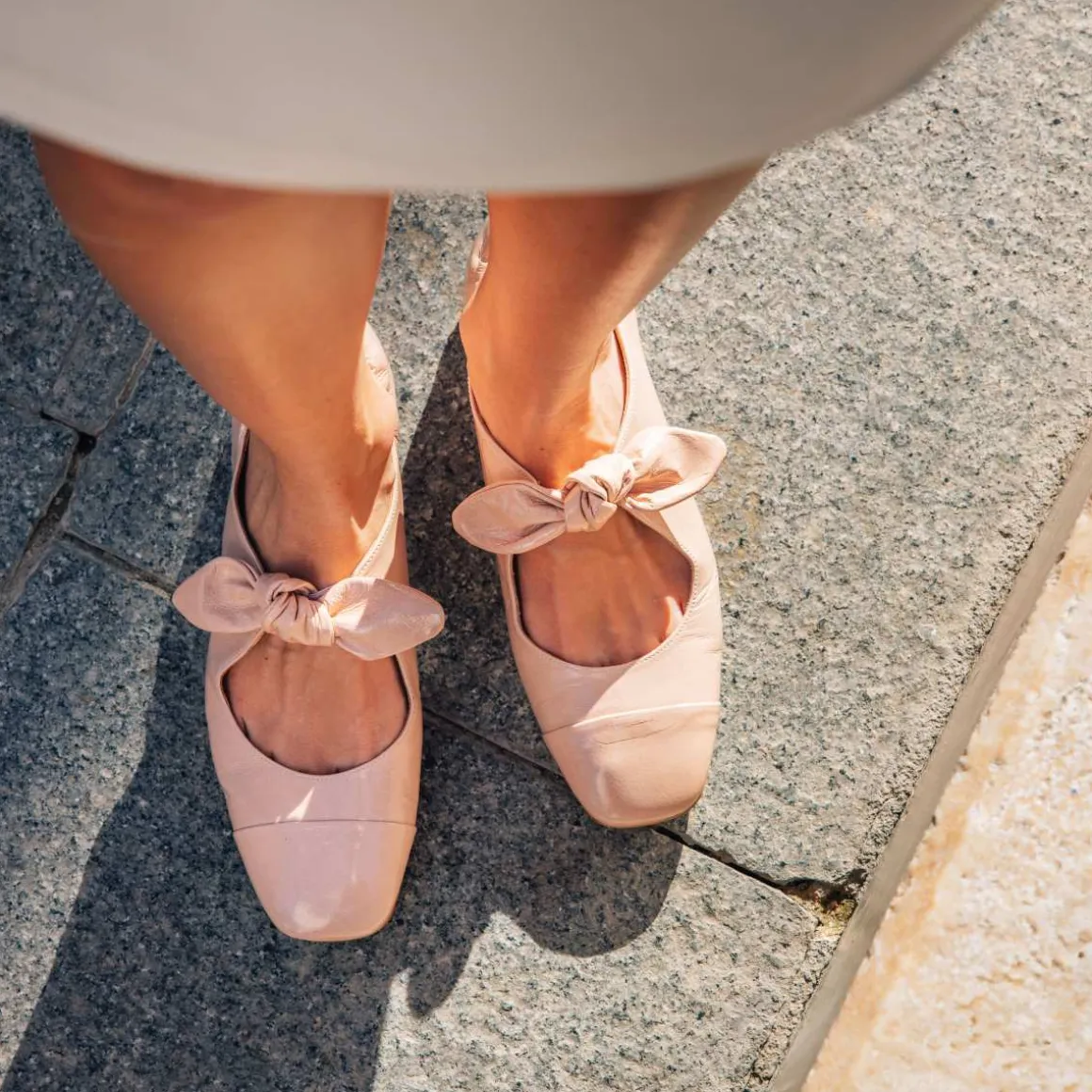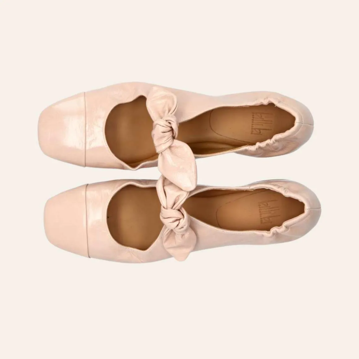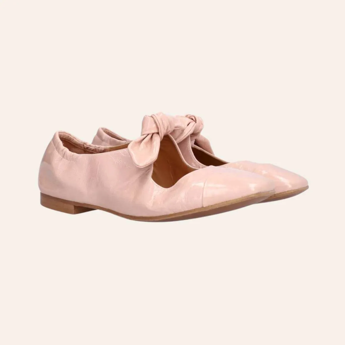 Denne ballerinaen er laget i rosa lakkskinn med firkantet tå. Den har en feminin sløyfedetalj over forfoten og dekorativ søm på tåen, samt en elastisk hælkappe bak for optimal komfort.