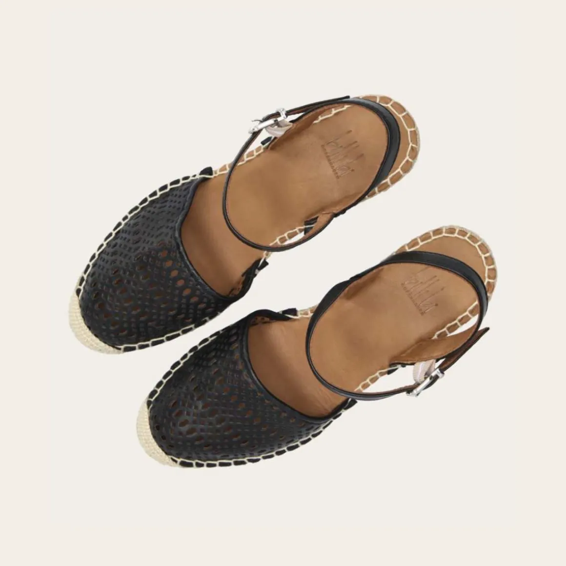 Håndlaget kilesandal med høy hæl fra Billi Bi, utført i sort glatt skinn med rund tå. Espadrillen har et attraktivt hullmønster over fronten, og ankelremmen lukkes med et firkantet sølvfarget spenne.