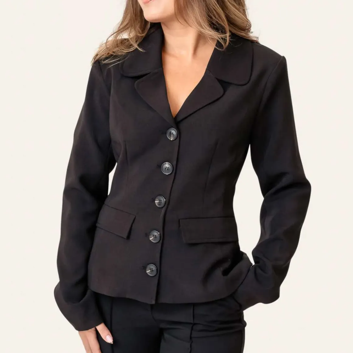En elegant, tettsittende blazer i svart. Jakken er designet med en definert midje som fremhever en feminin silhuett og skaper et sofistikert, skreddersydd utseende. Den har en klassisk krage, dekorative sømmer og lukking foran med iøynefallende naturtonede knapper som gir et eksklusivt preg. Foran har blazeren to lommer med klaff og en lett avrundet kant, noe som skaper den perfekte balansen mellom klassisk og moderne stil. Det myke, strukturerte stoffet gjør den behagelig å ha på seg samtidig som den beholder sin vakre form. Style den med de matchende SignatureIC-buksene for et komplett, tidløst sett – perfekt for kontoret, middagen eller arrangementer der du ønsker et polert og feminint utseende.