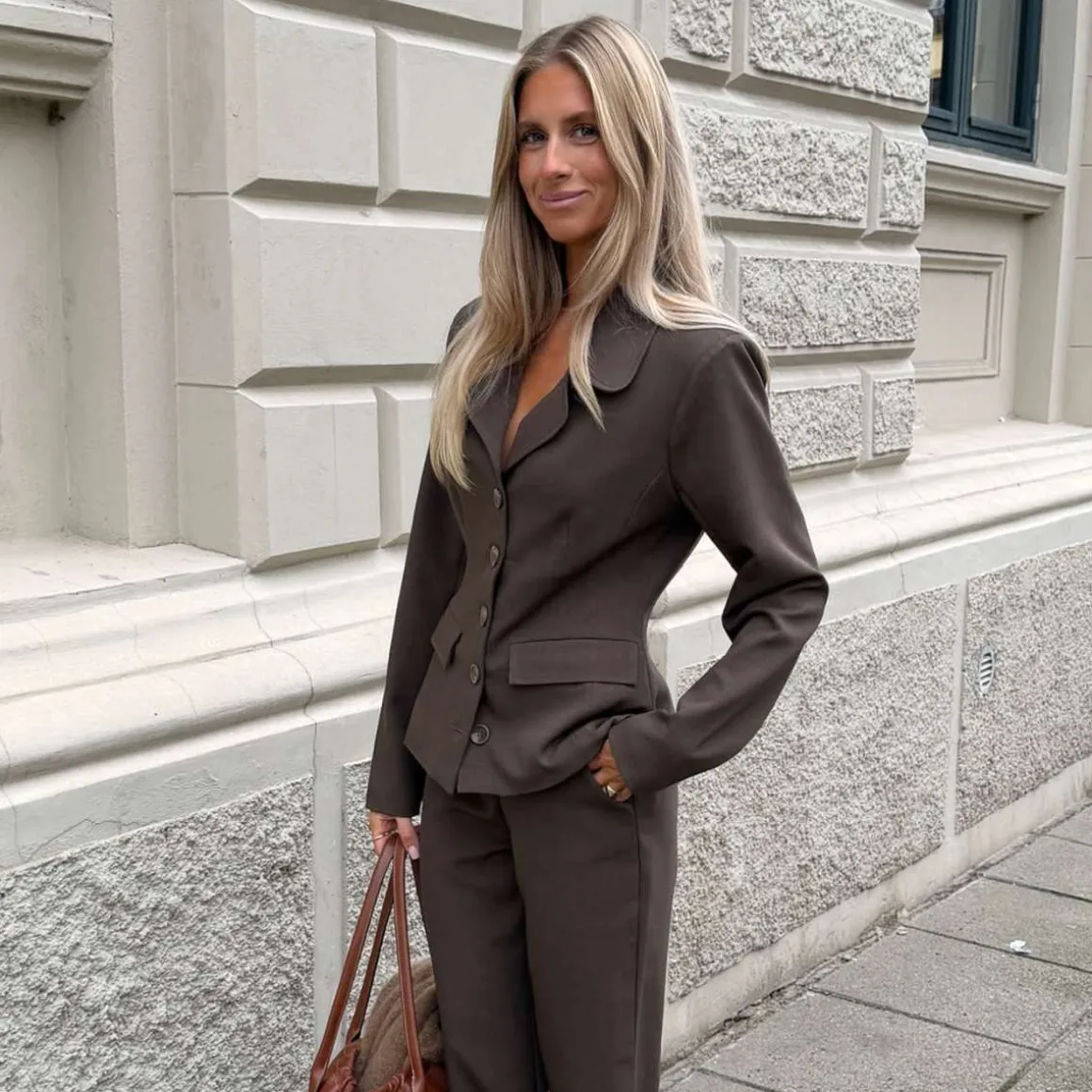 En elegant, tettsittende blazer i brunt. Jakken er designet med en definert midje som fremhever en feminin silhuett og skaper et sofistikert, skreddersydd utseende. Den har en klassisk krage, dekorative sømmer og lukking foran med iøynefallende naturtonede knapper som gir et eksklusivt preg. Foran har blazeren to lommer med klaff og en lett avrundet kant, noe som skaper den perfekte balansen mellom klassisk og moderne stil. Det myke, strukturerte stoffet gjør den behagelig å ha på seg samtidig som den beholder sin vakre form. Style den med de matchende SignatureIC-buksene for et komplett, tidløst sett – perfekt for kontoret, middagen eller arrangementer der du ønsker et polert og feminint utseende.