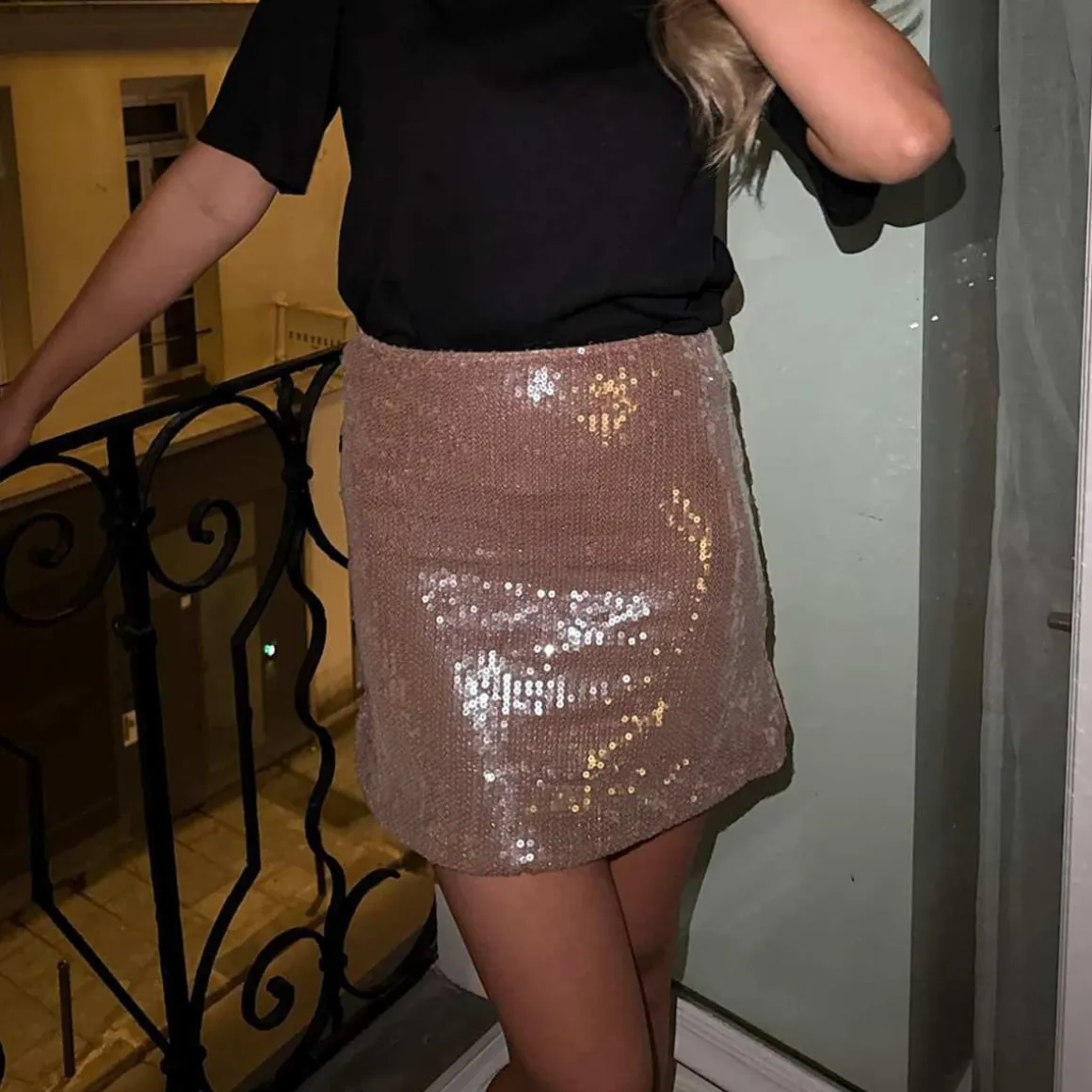 Et fantastisk, festlig miniskjørt dekket av skimrende paljetter i en elegant lysebrun nyanse. Skjørtet har en enkel, flatterende passform som sitter mykt rundt hoftene og faller vakkert over lårene. Det elastiske stoffet sikrer en komfortabel følelse, mens paljettoverflaten fanger lyset med hver bevegelse – perfekt for kvelder når du vil at antrekket ditt skal skinne. Style det med en enkel topp for et moderne og uanstrengt antrekk, eller kombiner det med den matchende paljetttoppen for et komplett festantrekk.