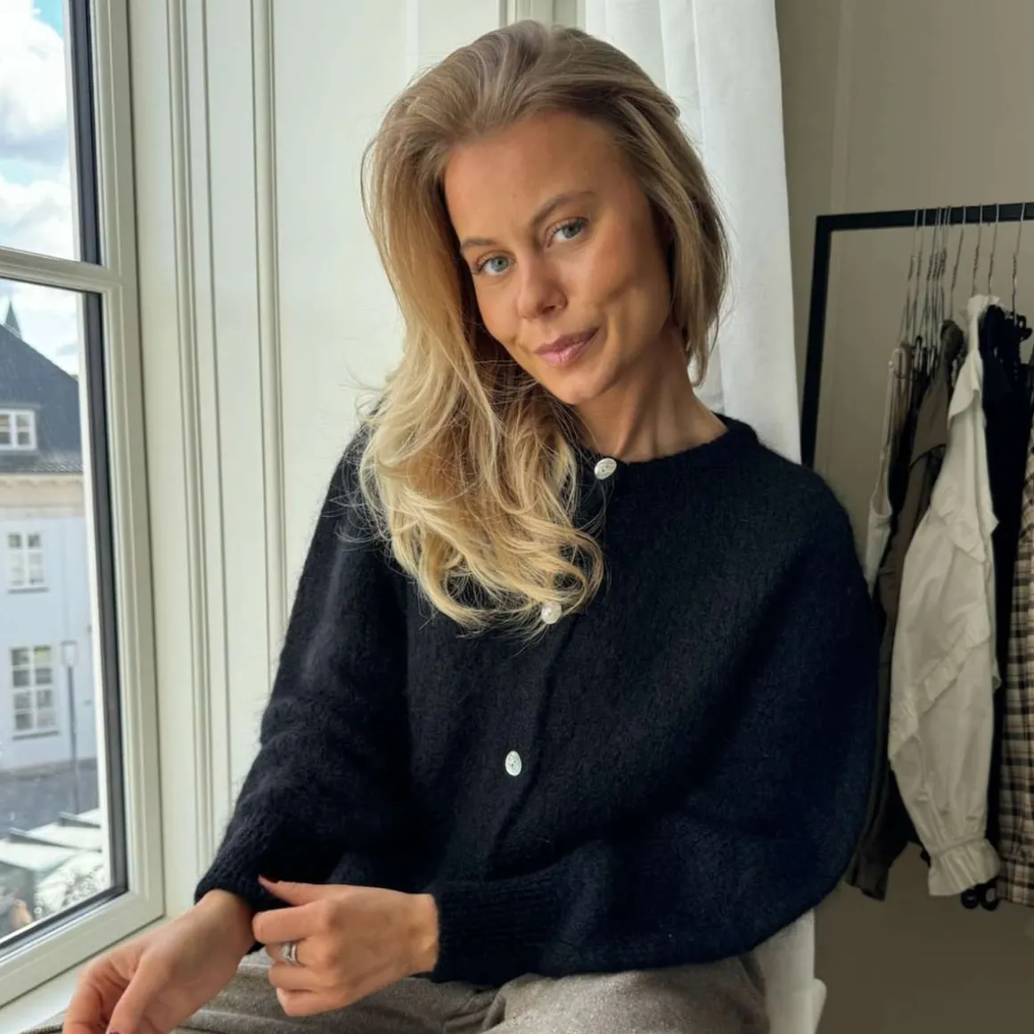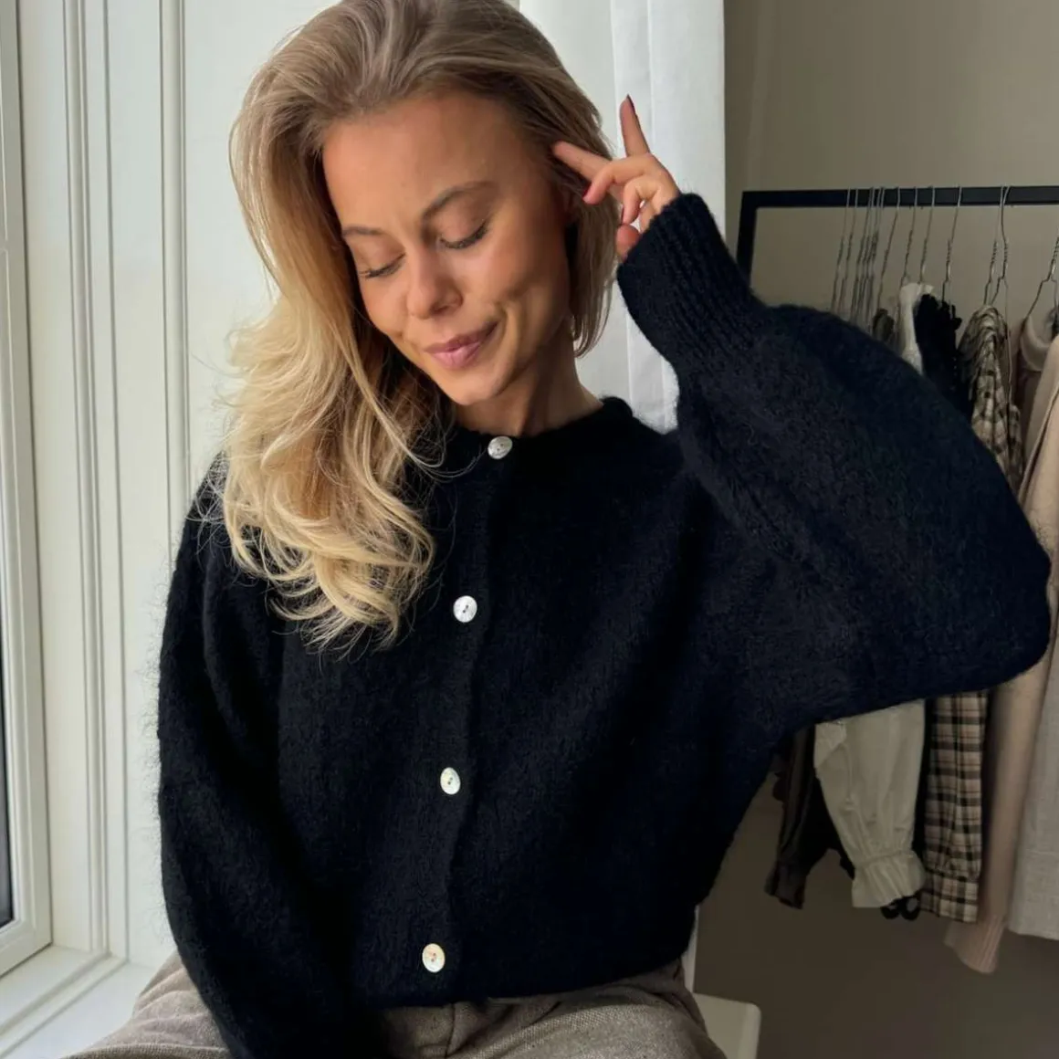 Lurvete mohairkofta med lange, voluminøse ermer, ribbestrikkede detaljer og perlemorslook på knappene.