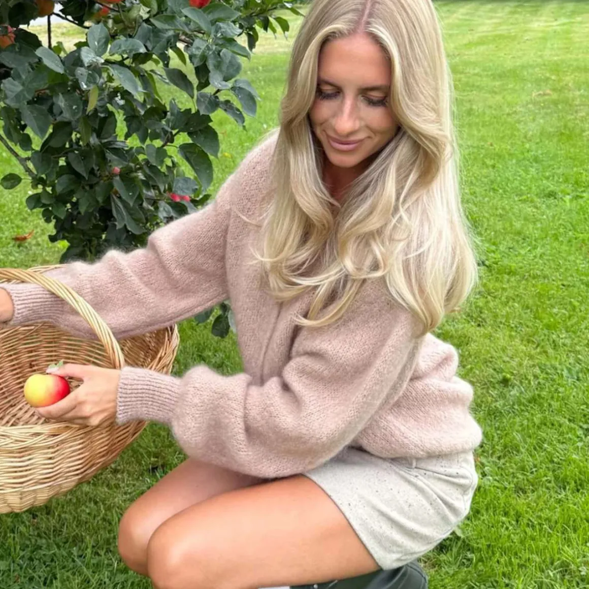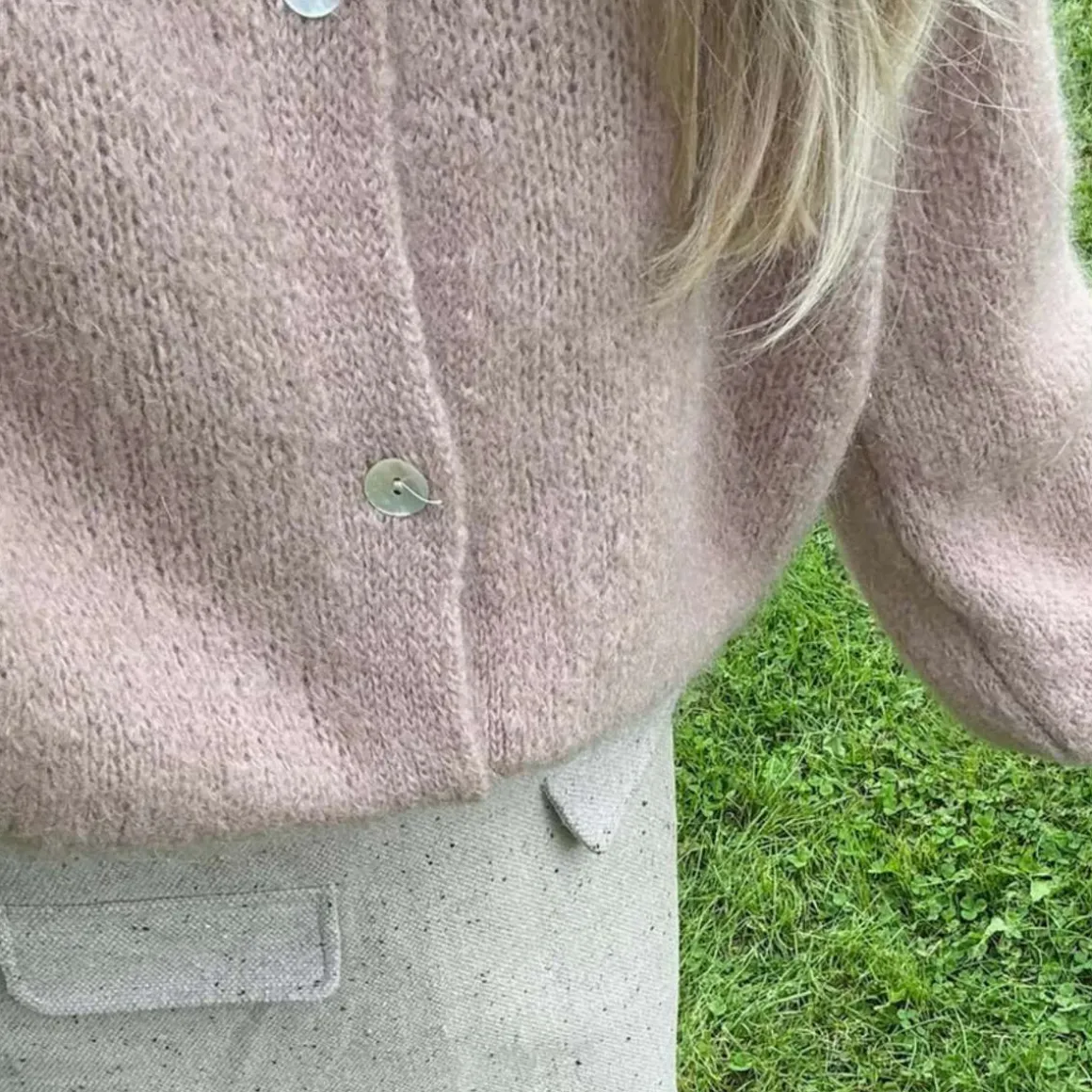 Lurvete mohairkofta med lange, voluminøse ermer, ribbestrikkede detaljer og perlemorslook på knappene.