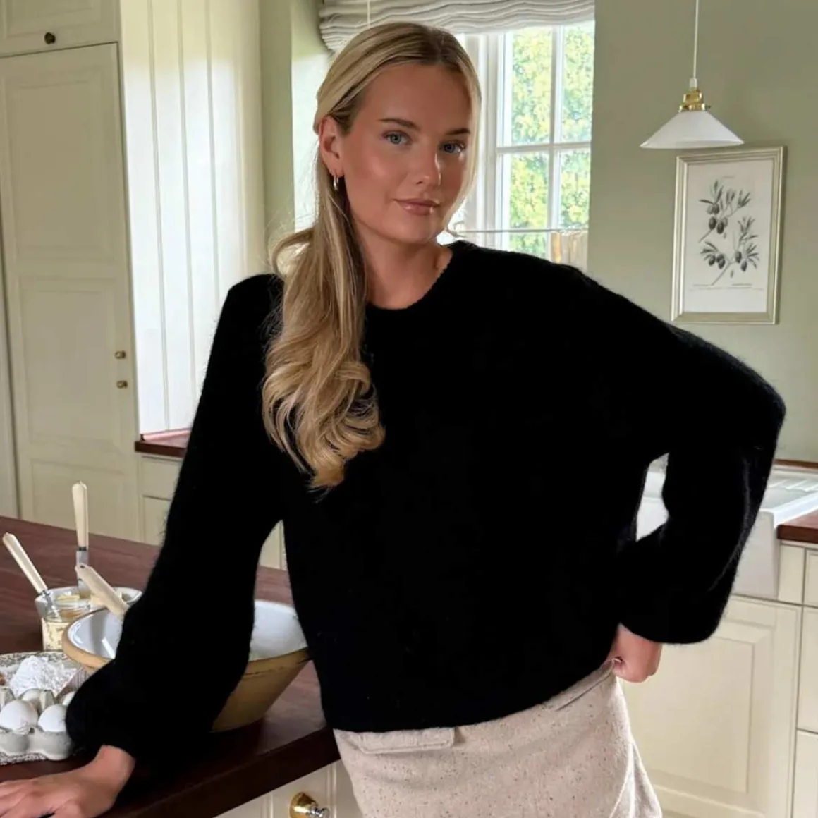 En myk og luksuriøs mohair-genser med lange ermer, lett puffet med smale ribbestrikkede mansjetter. Genseren har rund hals og fine ribbekanter både nederst og rundt halsen, som gir et elegant og raffinert uttrykk.