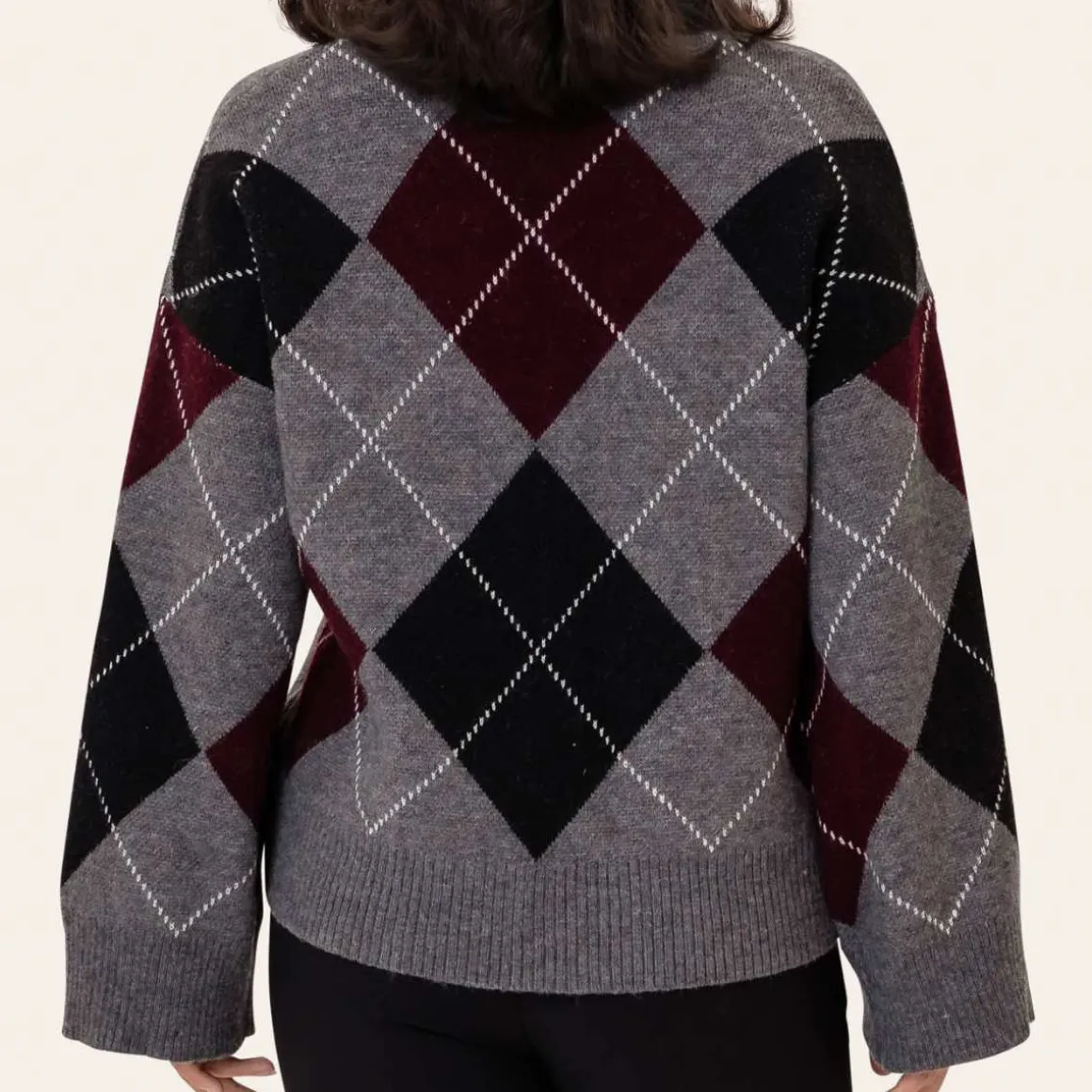 Klassisk cardigan fra BYIC med en moderne vri, med et argyle-mønster i nyanser av grått, svart og burgunder. Designet med en litt oversized passform, V-hals og knappelukking foran. De ribbede mansjettene og falden gir en diskré struktur, mens den myke, varme strikken gjør den perfekt for både hverdagsbruk og koselige anledninger.