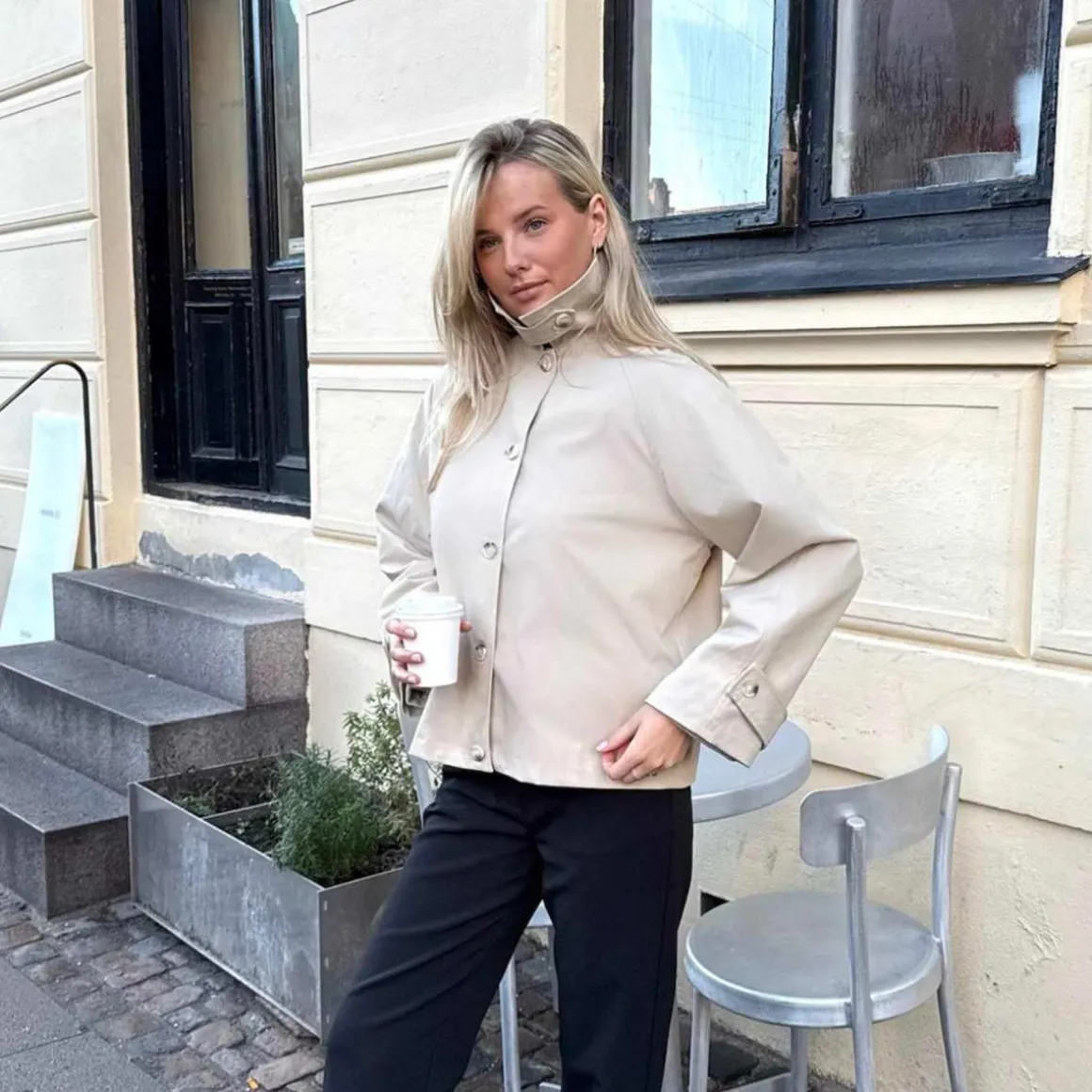 Elegant mørkebrun trenchcoat med løs passform i kroppen og i ermene. Trenchcoaten har en krage som også kan brettes opp med en knapp foran, noe som gir jakken en høy hals. Den har store naturfargede knapper nedover fronten for lukking og stroppedetaljer på ermene, som også festes med en stor naturfarget knapp. Trenchcoaten har leggdetaljer på baksiden, noe som gir jakken et elegant utseende.