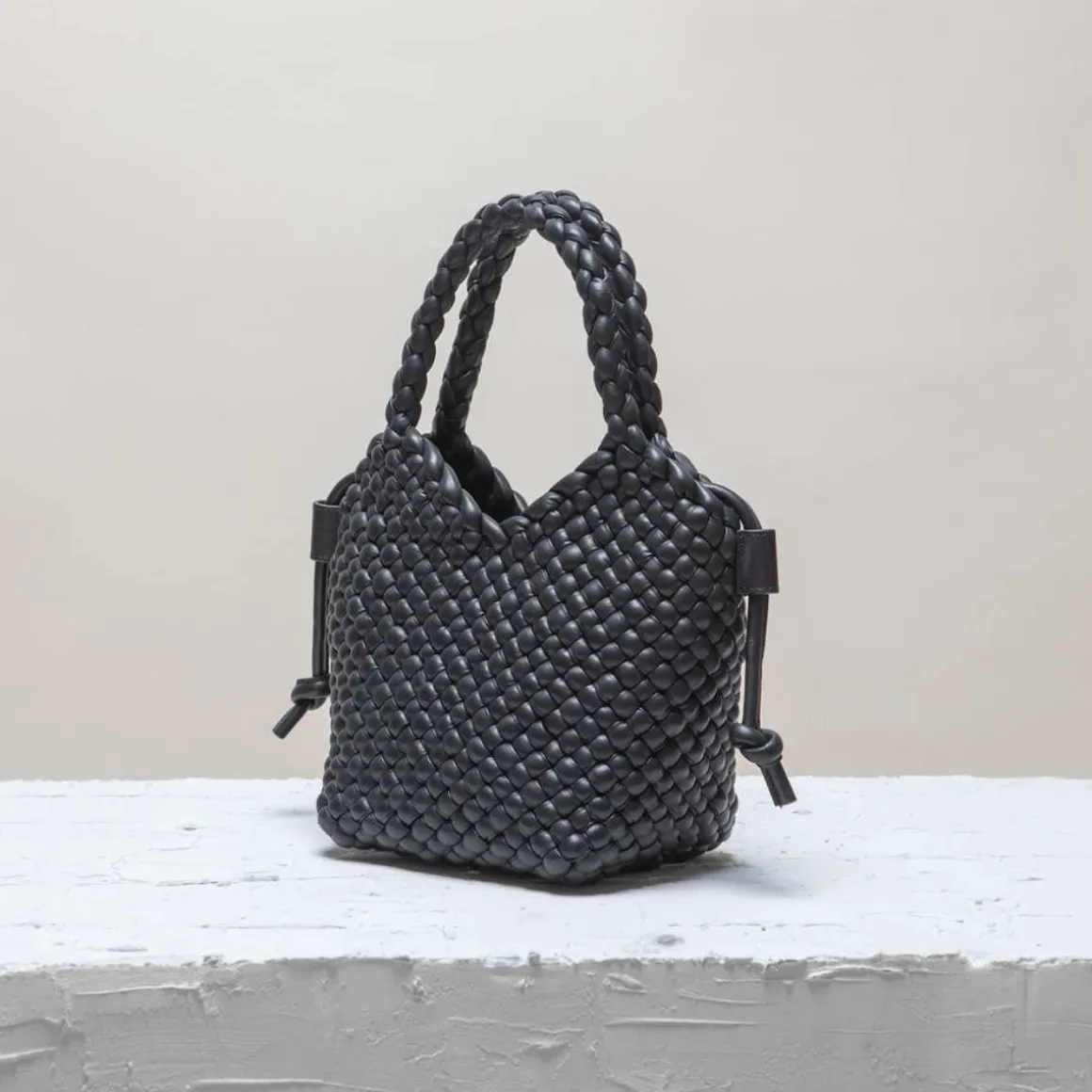 Maya fra Cala Jade. En myk cross-body-veske vevd i rørformede lærstrenger med justerbar skulderreim og avtakbar innerveske.