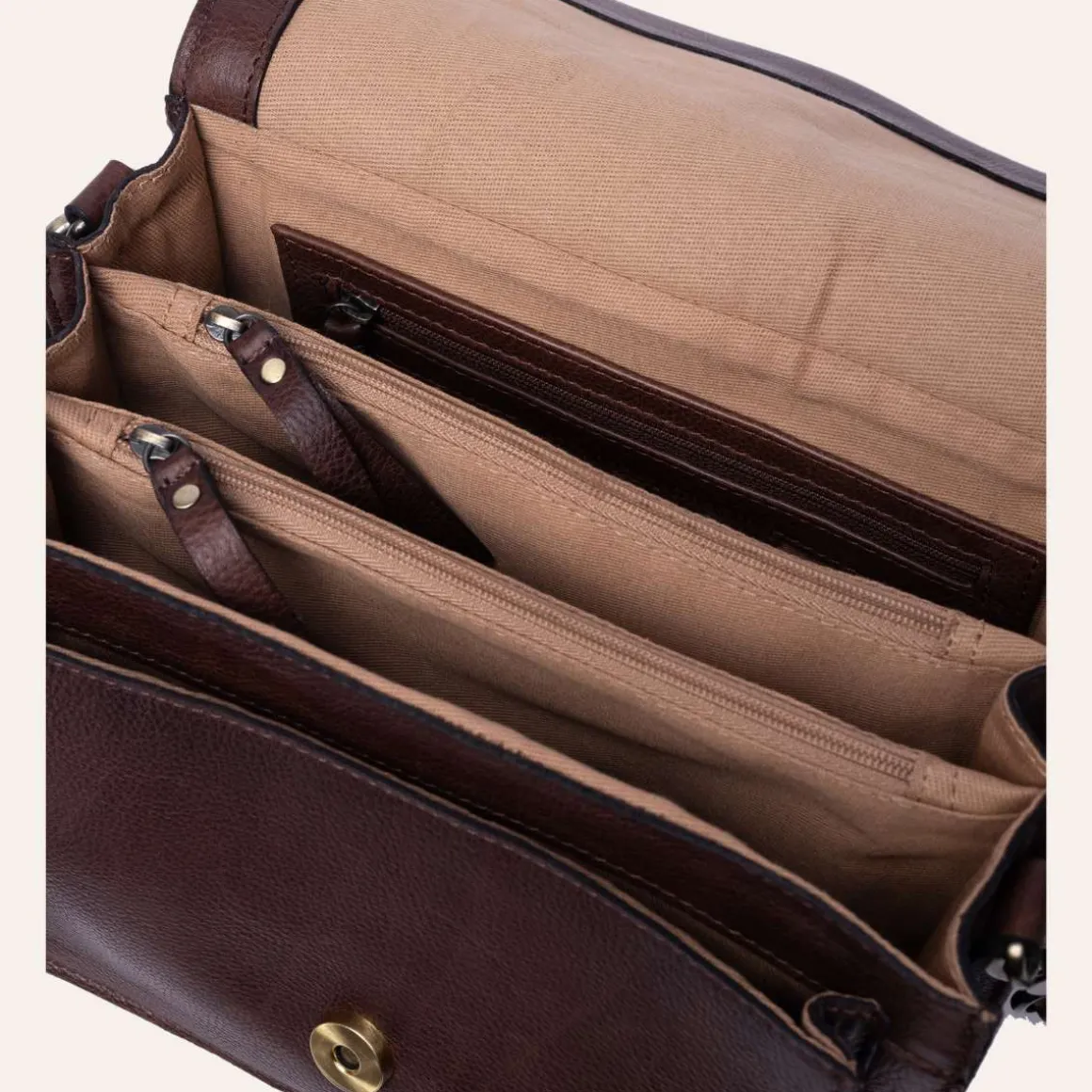 Den lukkes med knapp og har hele seks rom – fire åpne rom og to rom med glidelås – slik at du enkelt kan holde orden på mobil, lommebok og andre nødvendigheter. Den kompakte størrelsen gjør den perfekt både til hverdagsbruk og mer pyntede anledninger.