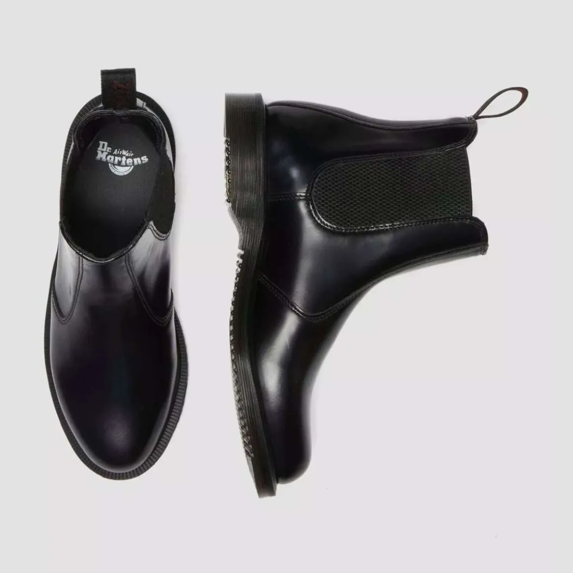 Sålen er lavprofilert med rillemønster og en ren welt-søm som gir et moderne og stilrent uttrykk. På sidene finner du elastiske paneler som gjør støvlene enkle å ta av og på, mens den ikoniske hælløkken i sort og grått gir den ekte Dr. Martens-signaturen.