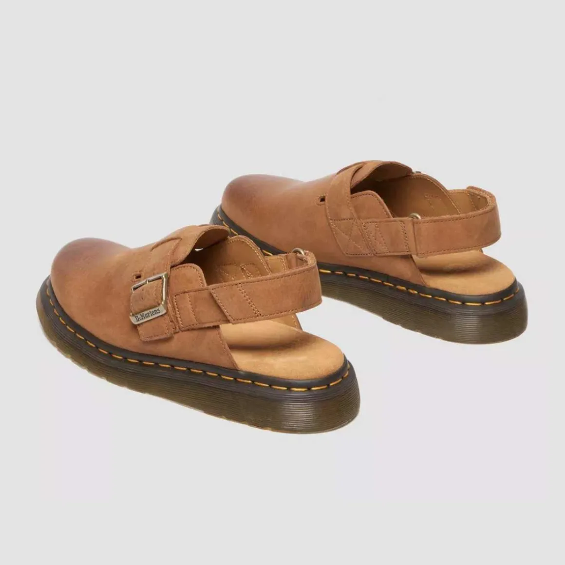 Delvis sko, dels sandal: Jorge II-muldyret handler om enkel bruk og hverdagslig allsidighet. Dette paret er bygget med nubuck-overdel og satt på Dr Martens klassiske Shore-sandalsåle. Klar til å gå hele sommeren. To justerbare stropper sikrer en behagelig passform. Gule welt-søm vil markere deg som en DM-bruker.