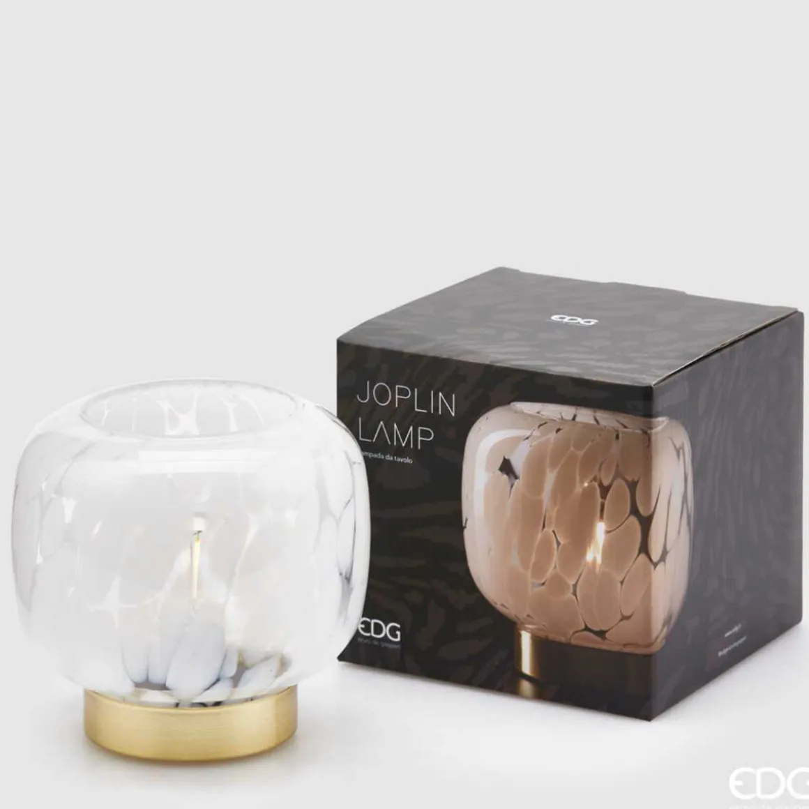 Glasslampe på gullfarget stett. Lampen er batteridrevet, så her trenger du ingen stikkontakt, bare tre små batterier.