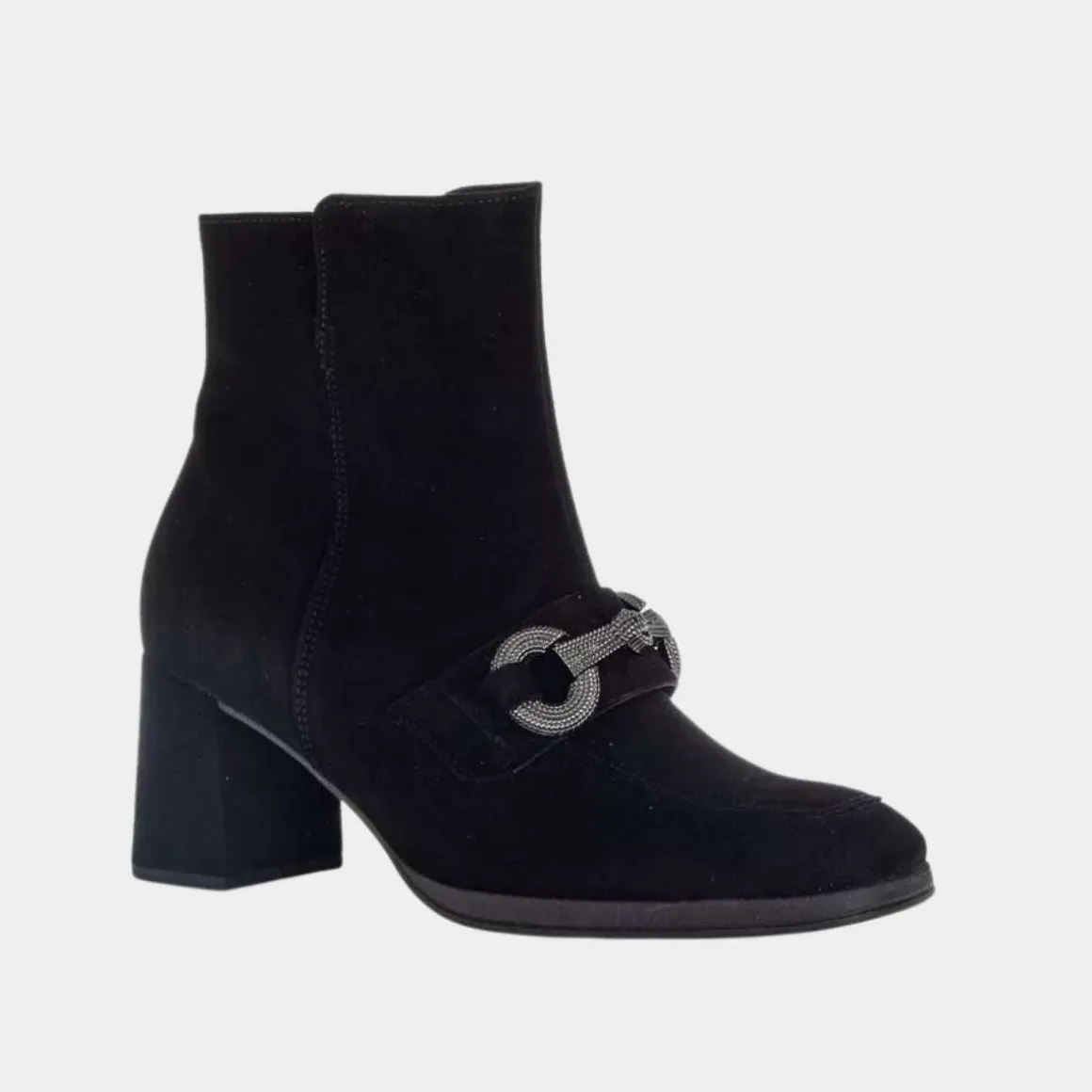 Elegant støvlett fra Gabor. Med Gabor trenger ikke komfort gå på bekostning av utseende. De er like bra ut som de er å gå på. Stabil blokkhæl på 6.5cm og semsket skinn for en ekstra fin look på skoen. Pyntet glam på fremsiden for det lille ekstra.