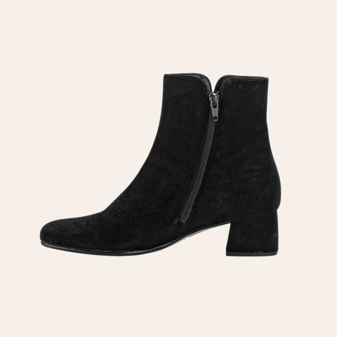 Denne svarte semskede ankelstøvletten fra Gabor med kledd hæl og elegant utskjæring er akkurat det du leter etter. Det klassiske designet i svart passer til ethvert antrekk. Takket være det faste fôret og den praktiske glidelåsen er denne støvletten ikke bare vakker, men også svært brukervennlig.