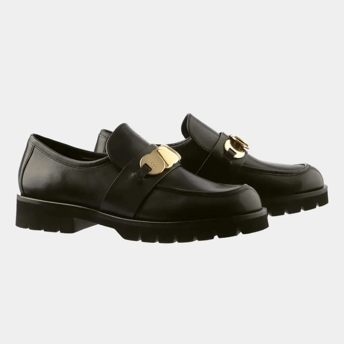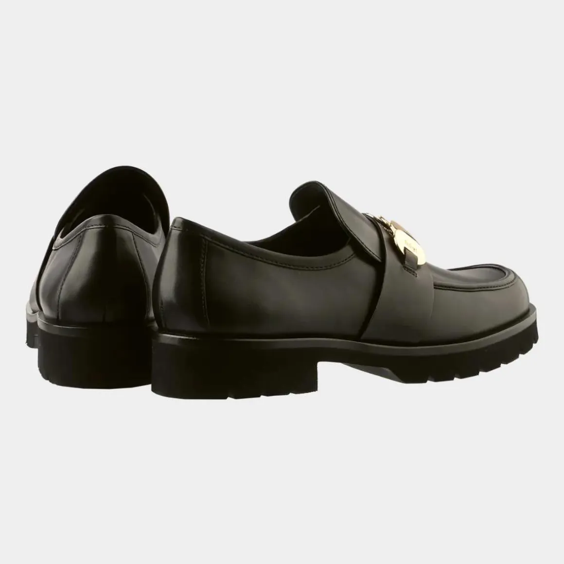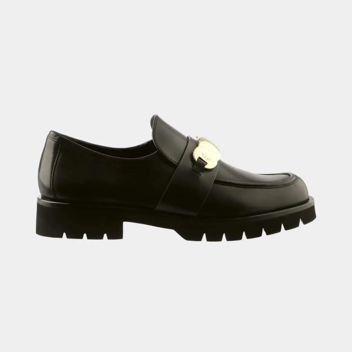 - Loafers i svart glatt skinn med smykkeelement og fremhevet såle