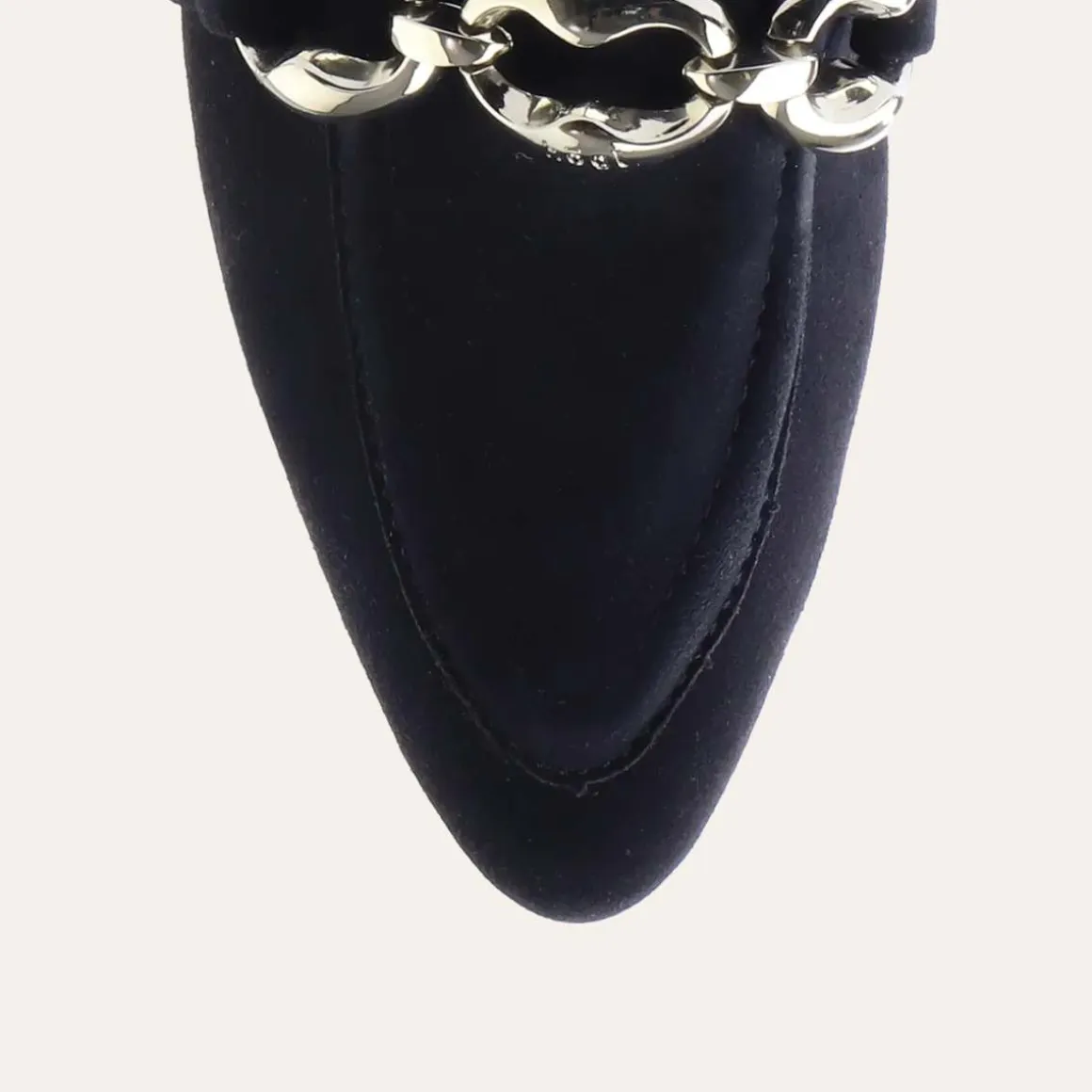 Designet løftes av dekorative sølvfargede kjededetaljer, som skaper en flott kontrast til det veluraktige skinnet. Den lave blokkhælen gir et feminint uttrykk samtidig som skoen er komfortabel gjennom hele dagen.