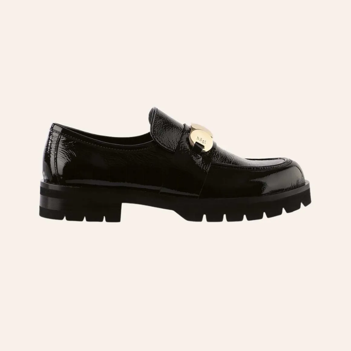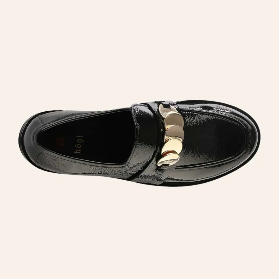 Den fremhevede sålen og de gullfargede myntdetaljene er de mest iøynefallende trekkene ved Høgl sin loafer «Alison». Det bærekraftige lakkæret har et sofistikert, glansfullt og krøllete utseende. Denne stilige, uformelle loaferen er inspirert av den trendy campusstilen. Designet kombinerer moderne eleganse med førsteklasses komfort, takket være passformen og materialene av høy kvalitet. Et moderne hverdagsplagg som løfter ethvert antrekk med stil og letthet.