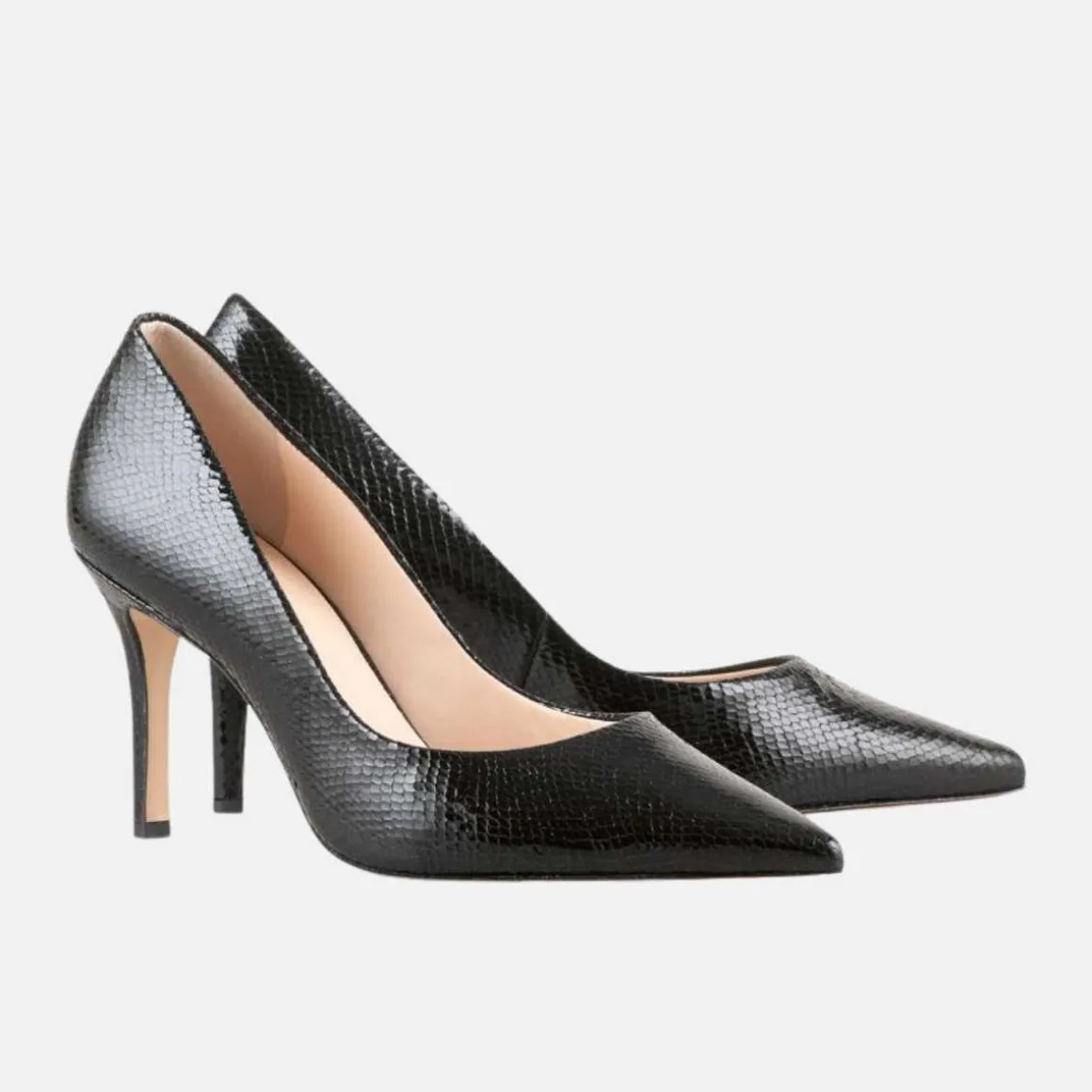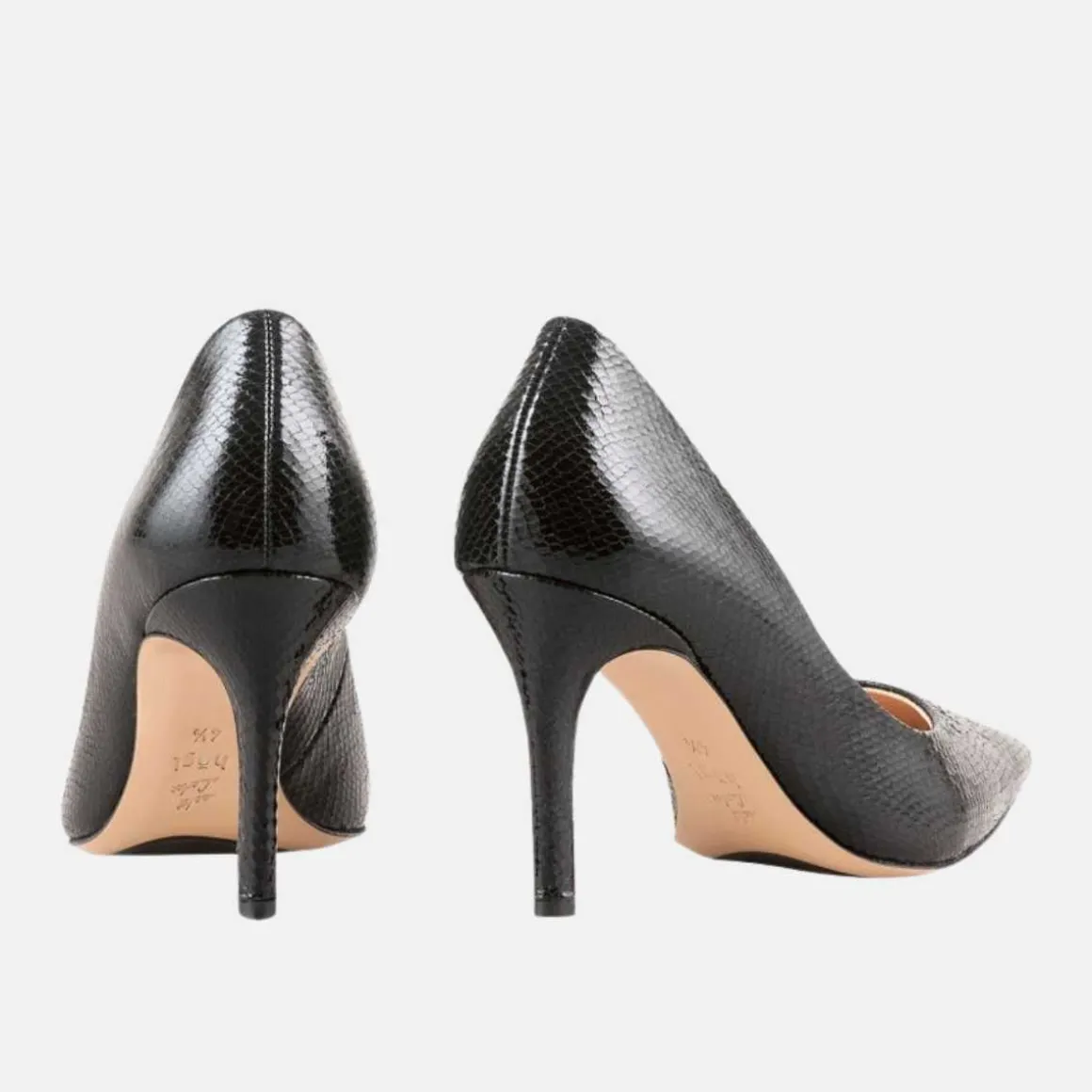 - Elegante pumps med stiletthæl laget av skinn i skinn med slangeskinnseffekt