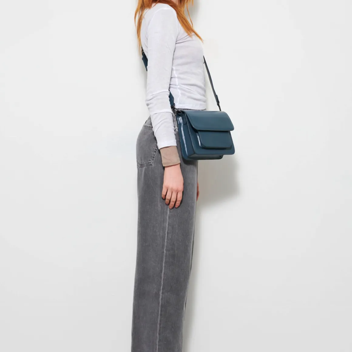 Crossbody-veske med magnetisk lukking og justerbar stropp. Vesken har en ytterlomme foran og et stort rom med en innerlomme.