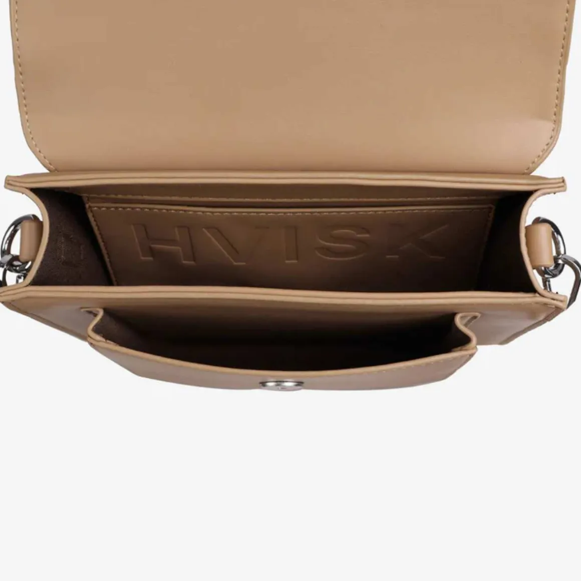 Crossbody-veske fra Hvisk med magnetlukking og justerbar skulderrem. Vesken har en utvendig frontlomme og ett stort hovedrom med en innvendig lomme for småting.