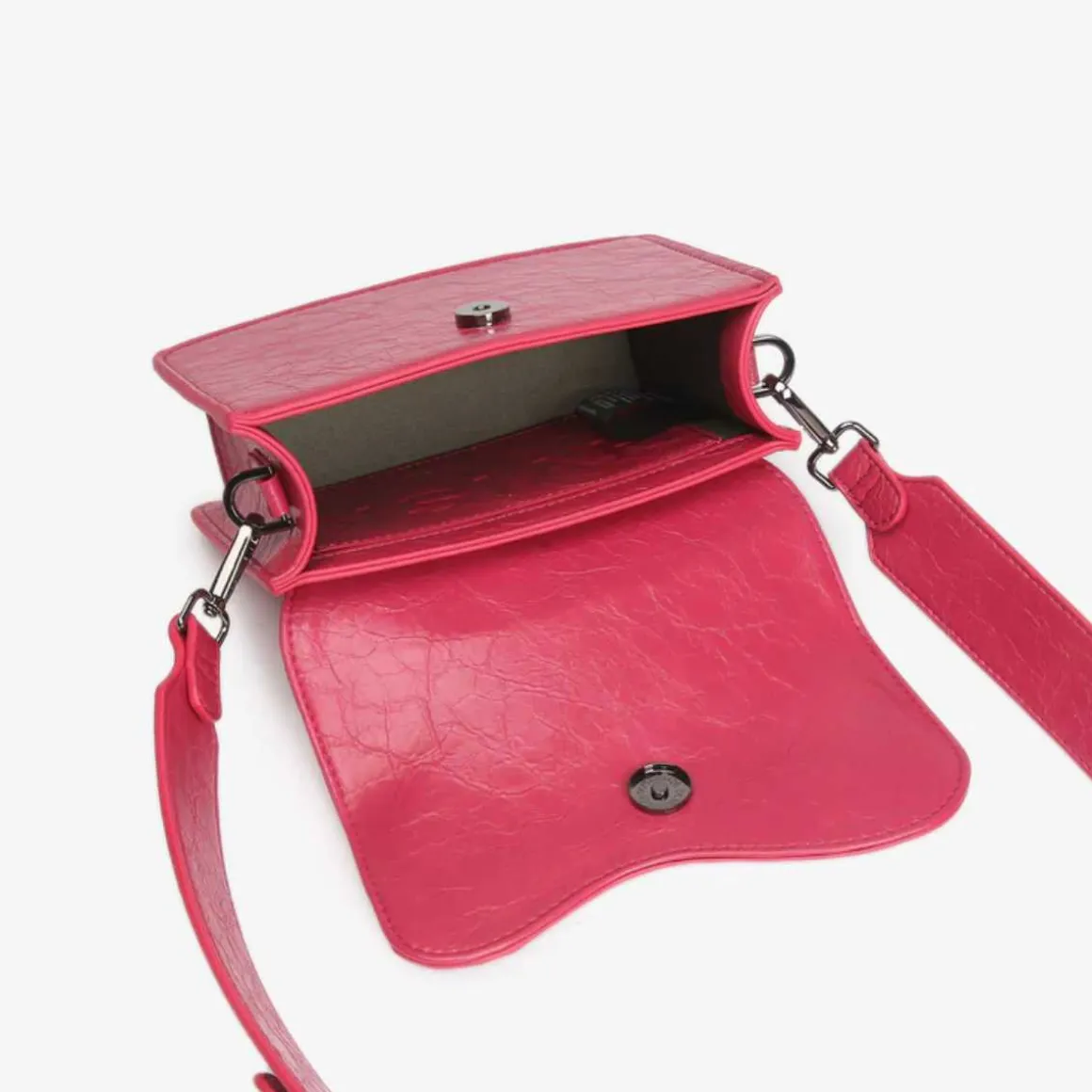 Miniveske med bølgete designdetaljer. Vesken har magnetisk lukking og inneholder ett rom med en innvendig glidelåslomme. Vesken har et kort håndtak og en justerbar skulderrem.