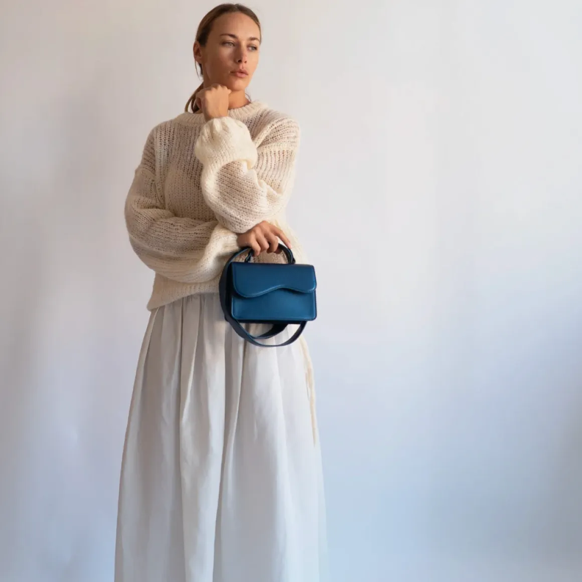 Miniveske med bølgede designdetaljer. Vesken har magnetisk lukking og ett rom med en innvendig glidelåslomme. Den har et kort håndtak og en justerbar crossbody-stropp.