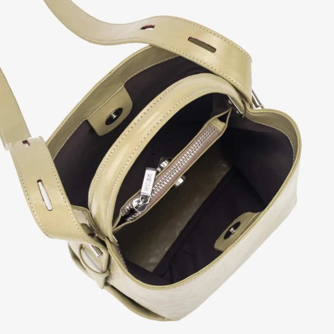 Stilren bucket bag fra Hvisk med moderne design og funksjonelle detaljer. Vesken har ett hovedrom og en praktisk innvendig glidelåslomme plassert i midten som skillevegg, noe som gjør det enkelt å organisere innholdet.