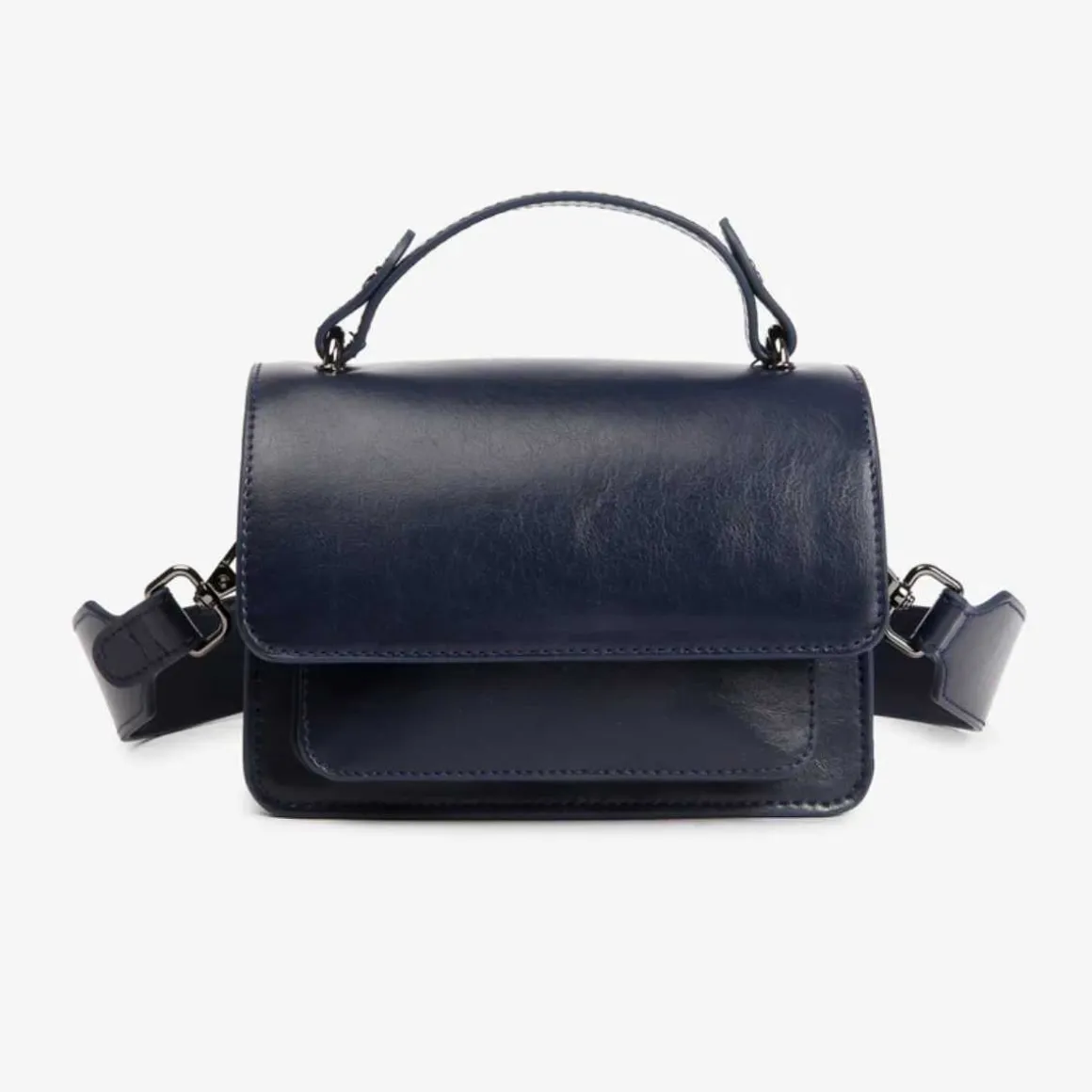 Miniveske med kort håndtak og avtakbar, justerbar skulderrem. Vesken har ett hovedrom og en frontlomme.