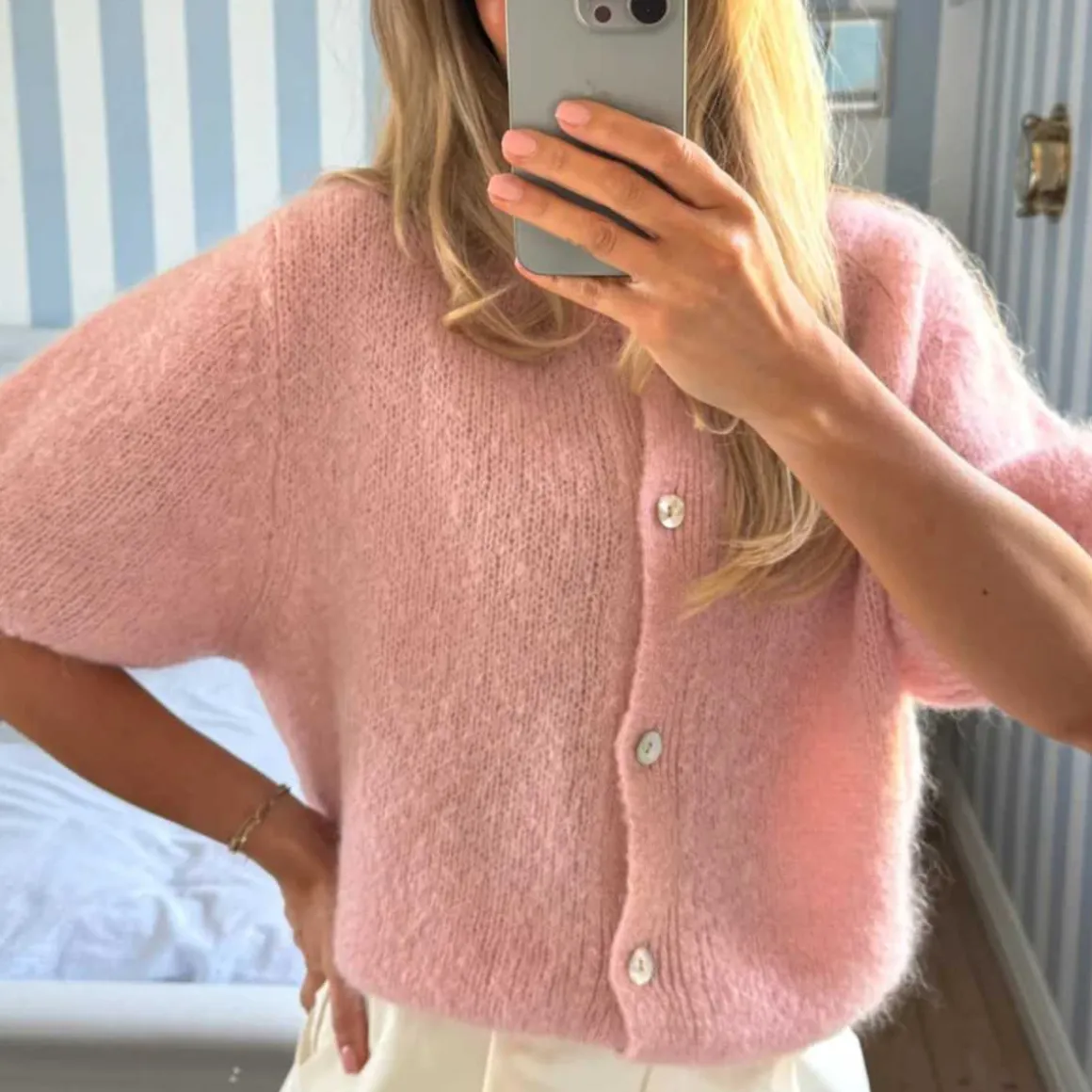Fuzzy mohair cardigan med lange voluminøse korte ermer, ribbedetaljer og perlemorlook på knappene.