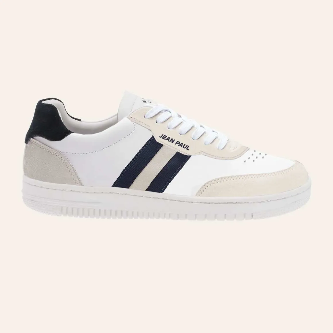 Klassisk og komfortabel tennisinspirert sneakers. Tå- og hælparti i semsket PU. Snørestykke med 7 lissehull. Dekorativt stripet bånd på siden. God dempet innersåle og hvit yttersåle i non-marking TPR. Logo på tunge og side.