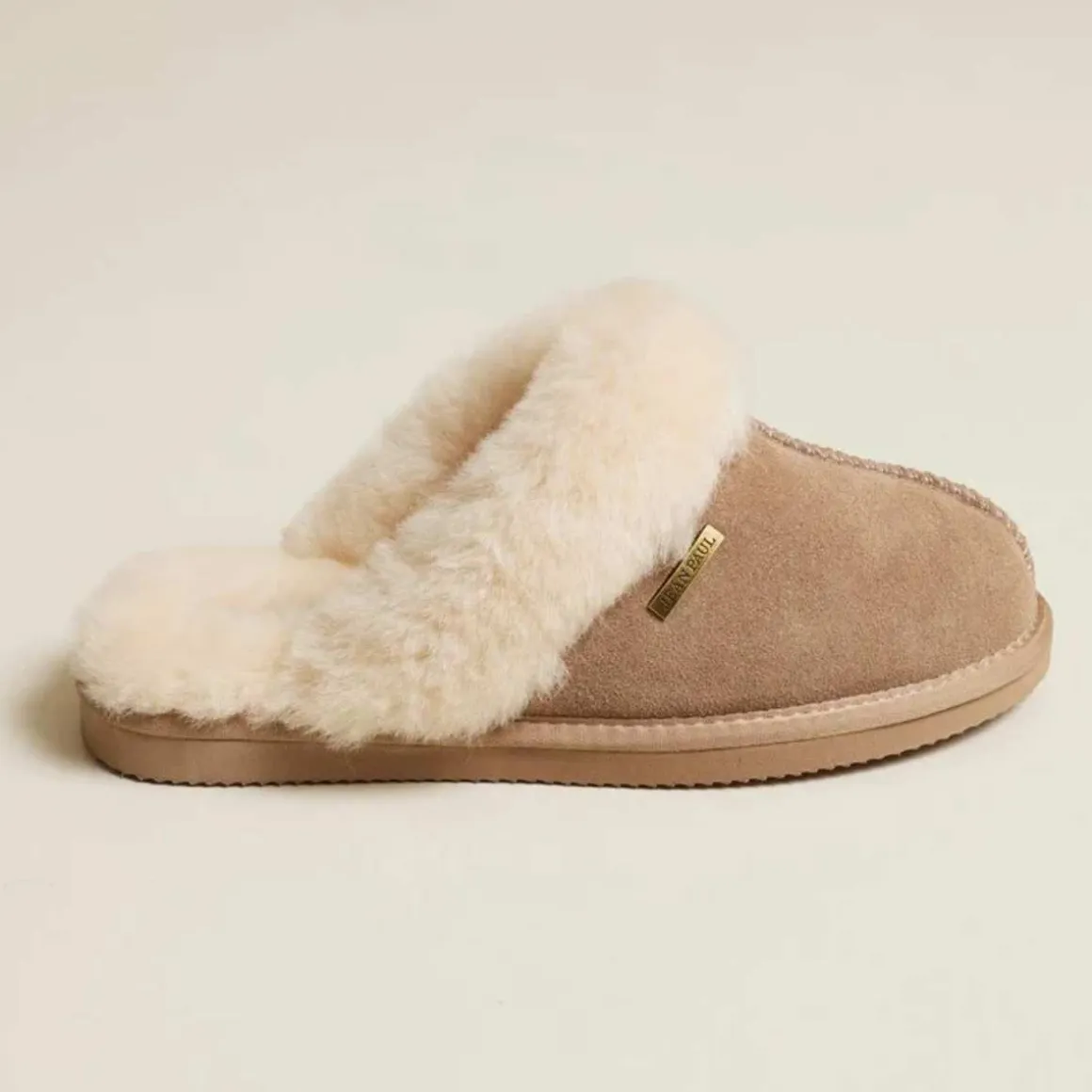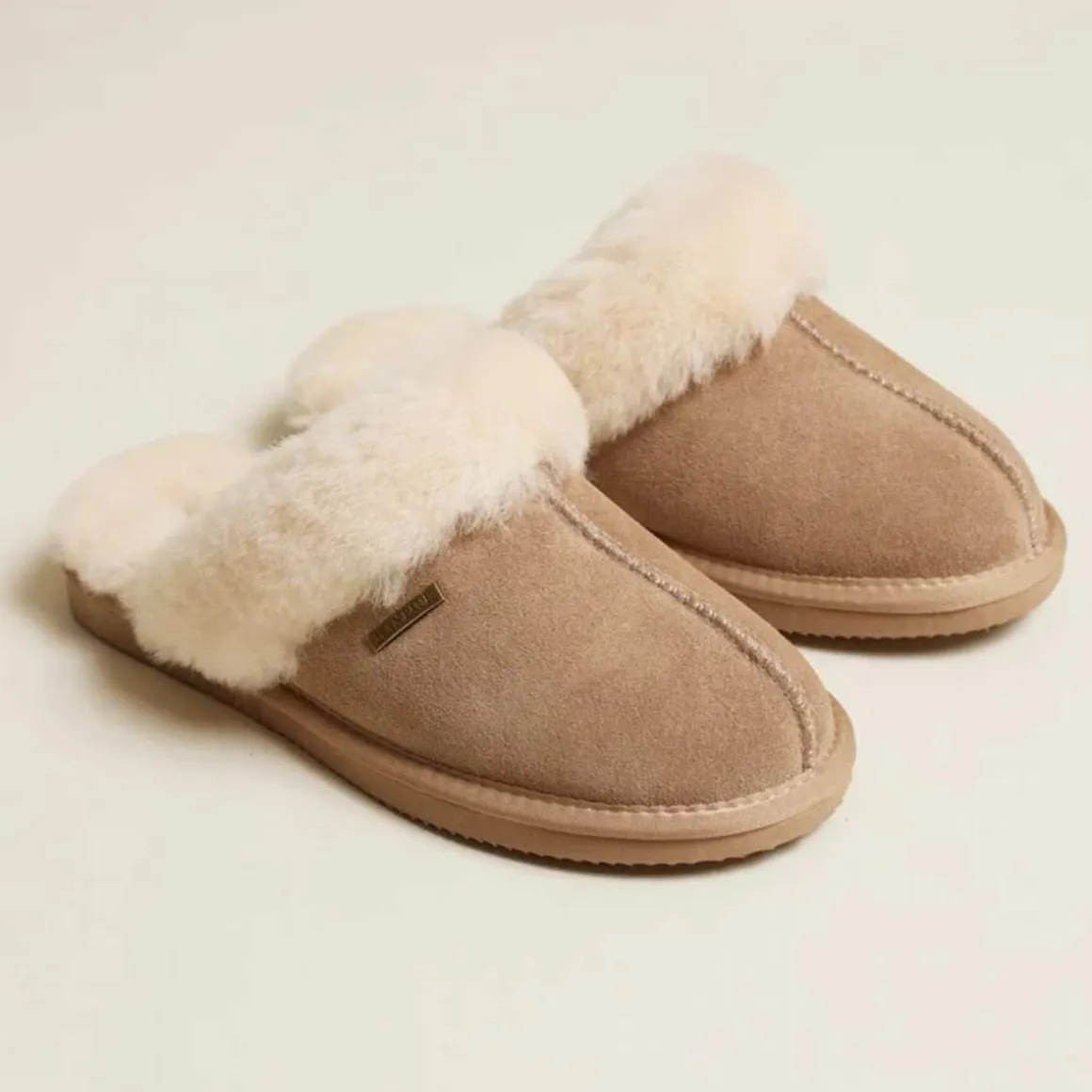 Opplev ekte hverdagsluksus med denne lette og behagelige slip-in tøffelen i mykt semsket skinn. Den lune saueskinnskrangen og det deilige ullfôret holder føttene varme, mens EVA-yttersålen gir god demping og komfort. Den sklisikre gummisålen gjør tøffelen perfekt både inne og ute, og den diskré logoen på siden setter prikken over i-en på det stilrene designet.
