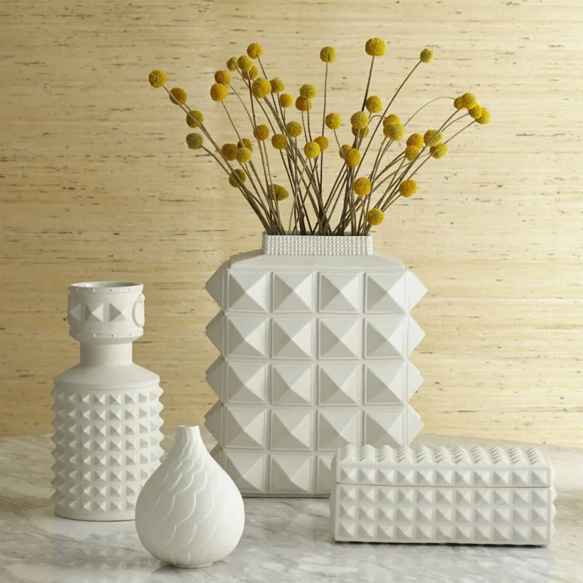 Dekorativ vase fra Jonathan Alder. Tøff glamour har aldri sett så bra ut. Med skarpe linjer og en grafisk silhuett, får vår Charade Studded Vase en ekstra dimensjon med sitt uglaserte eksteriør. Den er den perfekte størrelsen for en inngangskonsoll eller som et midtpunkt på et glam middagsselskap.