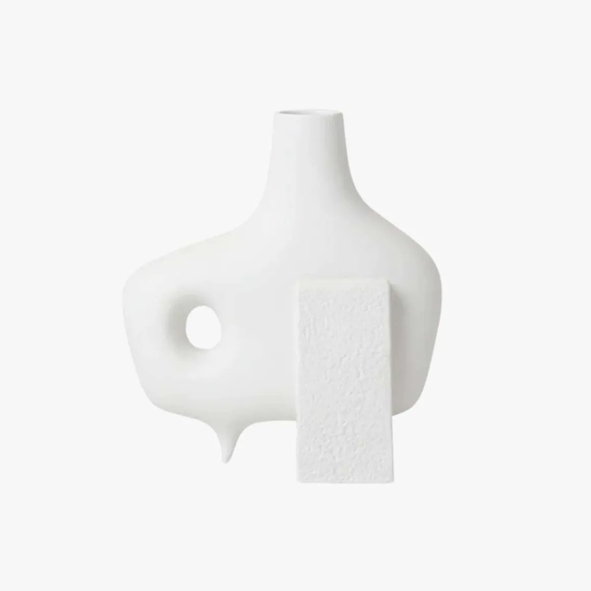 Funksjonelle skulpturer med glatte organiske former som krysser hverandre med grovteksturerte porselensblokker. Den perfekte vase for fargerike knopper å poppe, den gir også et sterkt uttrykk uten.