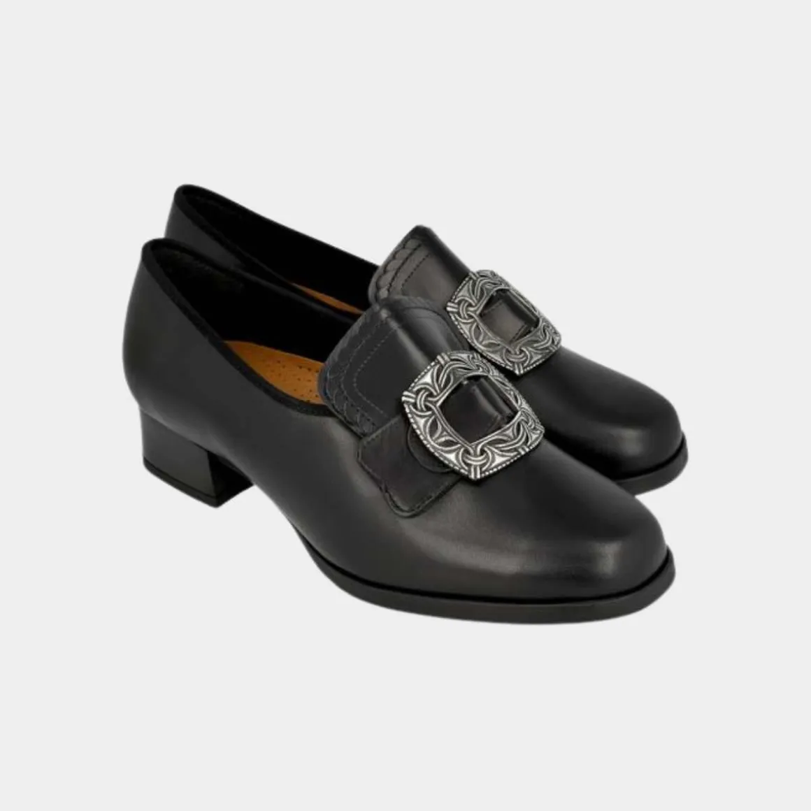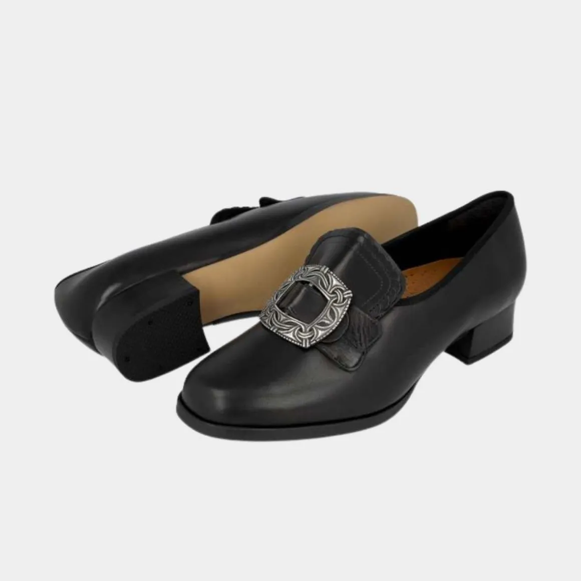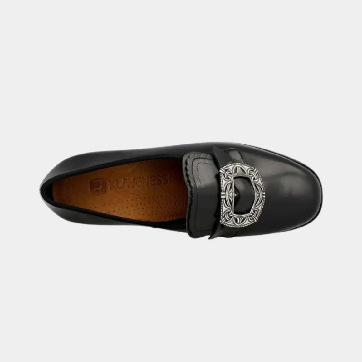 Klaveness Eli er en av de bunadskoene med mest volum og bredde. Bunadskoen har overdel i sort kalveskinn av høy kvalitet, og med mykt tekstil fòr med gode pusteegenskaper. Bunadskoen har stabil hel- og tåkappe som gir meget god komfort. Bunadskoen har neolit såle som er meget godt egnet for ute bruk under norske værforhold.