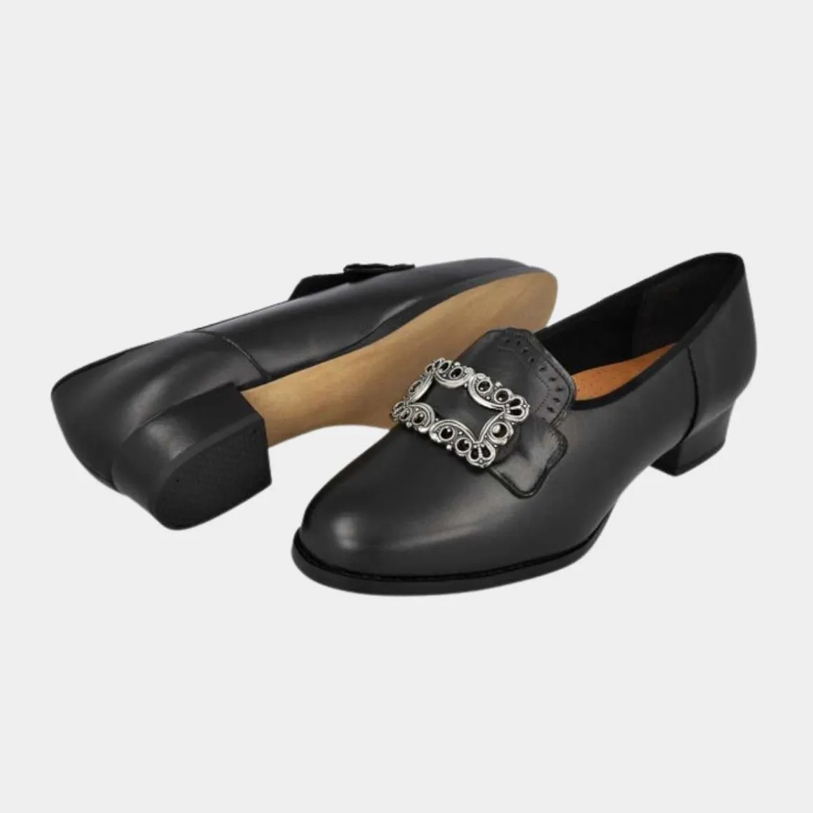 Bunadskoen har overdel i sort kalveskinn av høy kvalitet, og med mykt tekstil fòr med gode pusteegenskaper. Bunadskoen har stabil hel- og tåkappe som gir meget god komfort. Bunadskoen har neolit såle som er meget godt egnet for ute bruk under norske værforhold.