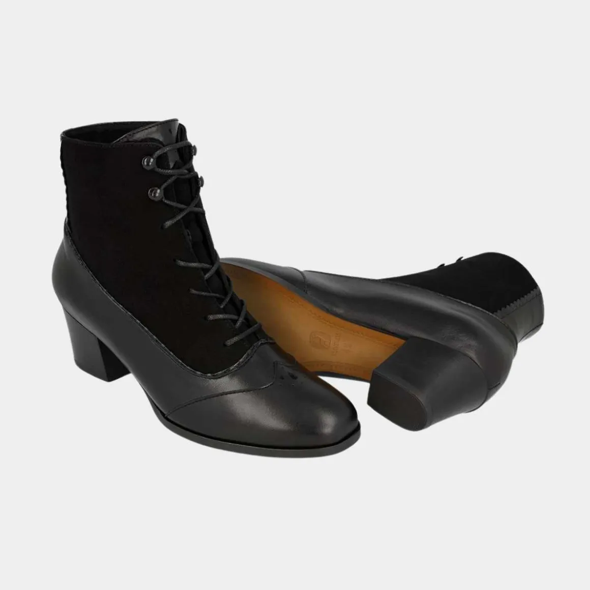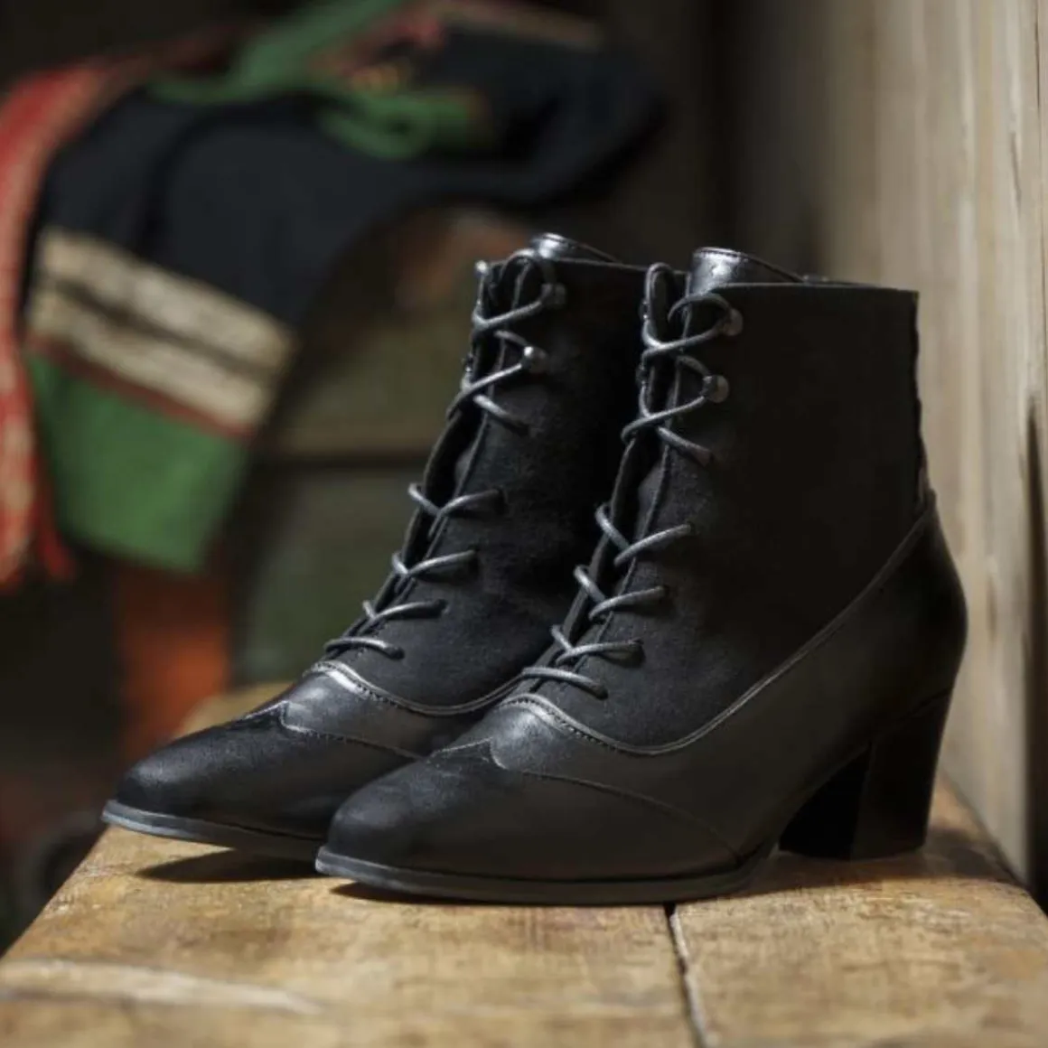 Bunadstøvletten er foret med skinn, har uttagbar innersåle og leveres med ett ekstra sett med sateng lisser.