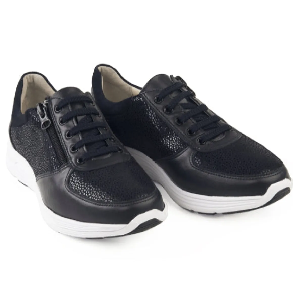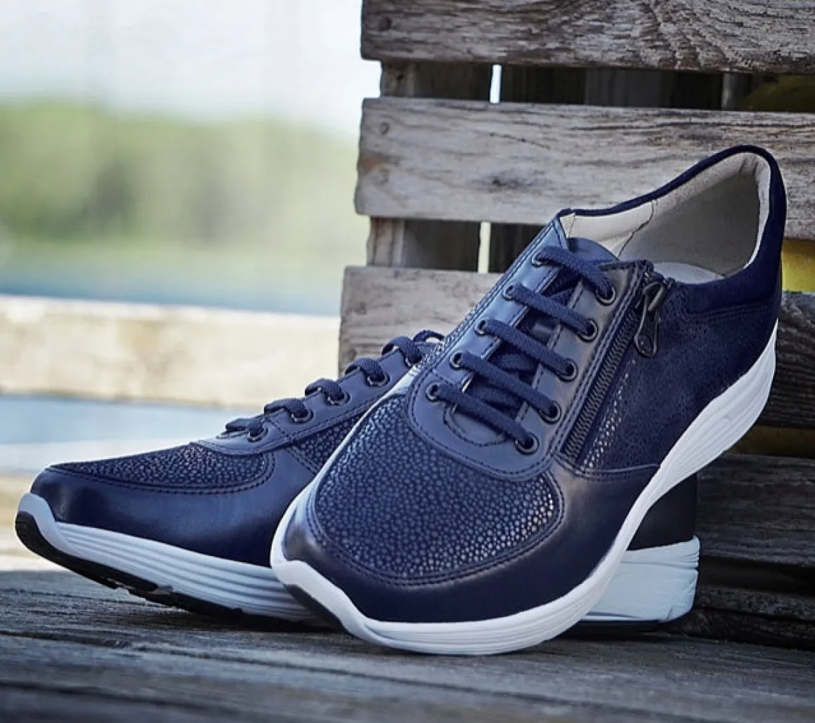 En av Klaveness siste utviklinger: en sporty joggesko med en trendy blanding av kombinasjon av lær på overdelen og skinnfôr med god pusteevne. Perfekt for et avslappet, aktivt utseende, og denne snørestilen har også glidelås langs siden for enkel å ta på og av.