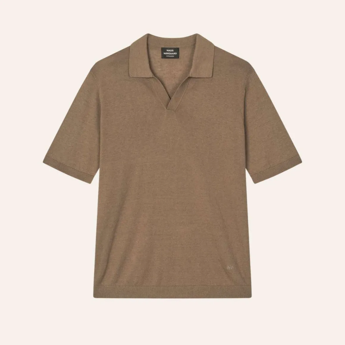 Kortermet poloskjorte fra Mads Nørgaard med et rent og enkelt uttrykk. Modellen har en åpen V-splitt i halsen, ribbestrikkede mansjetter og kant nederst, samt en liten ton-i-ton-brodering nederst. Passformen er rett og avslappet, med glatte flater og en nøytral, ensfarget finish.