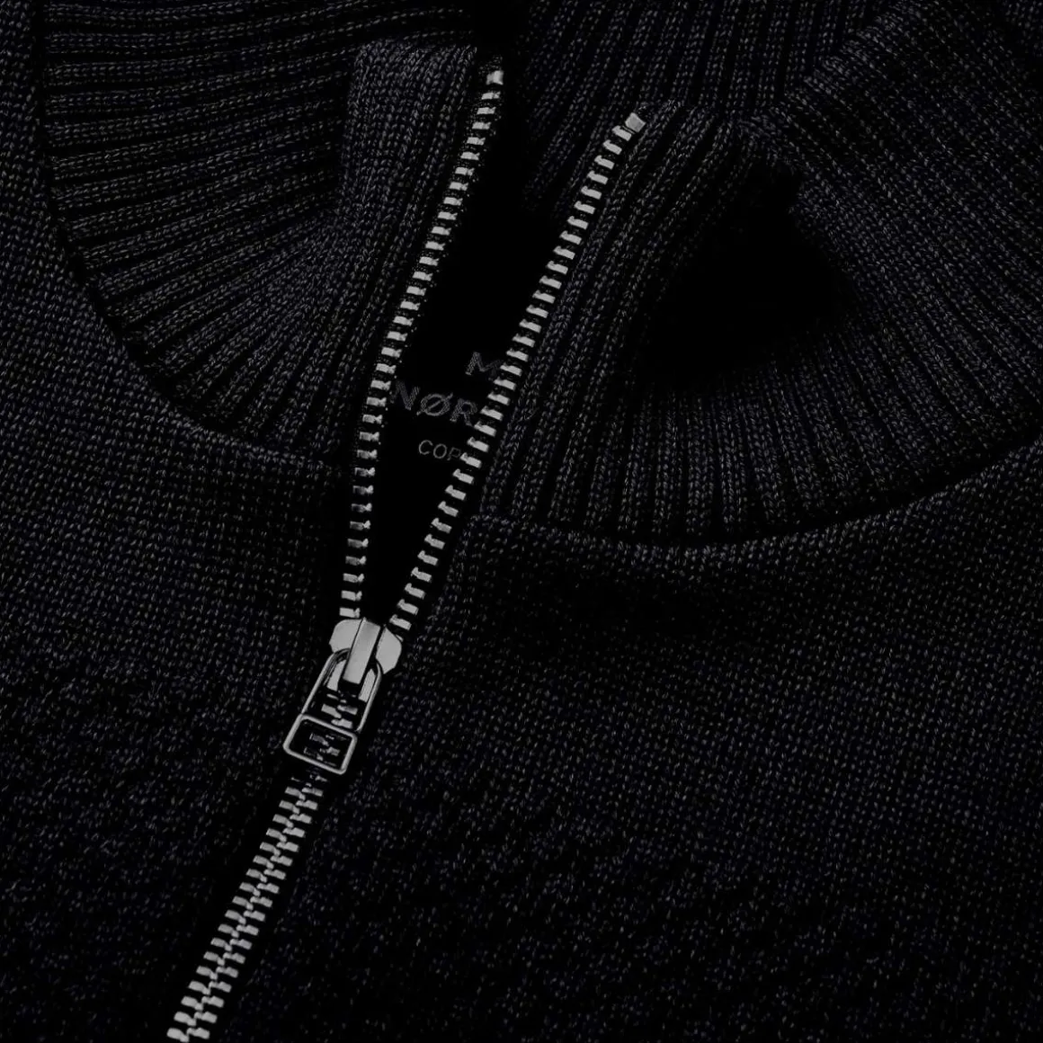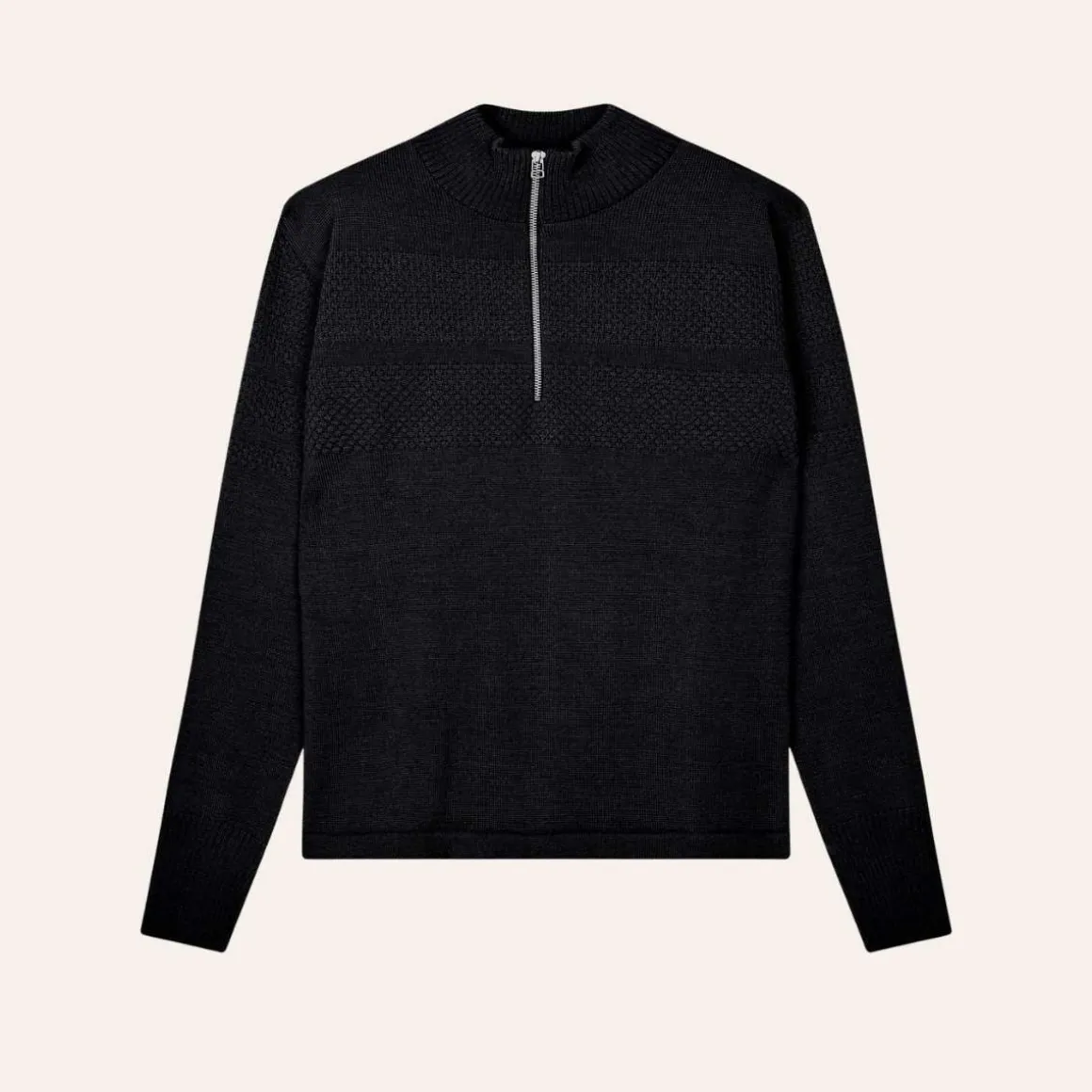 En chunky sailor-strikkegenser fra Mads Nørgaard med glidelås til midt på brystet, høy hals og lange ermer med oppbrettbare mansjetter. Den grove strikken gir et tidløst, maritimt uttrykk, mens ullmaterialet sørger for varme og komfort gjennom hele sesongen.